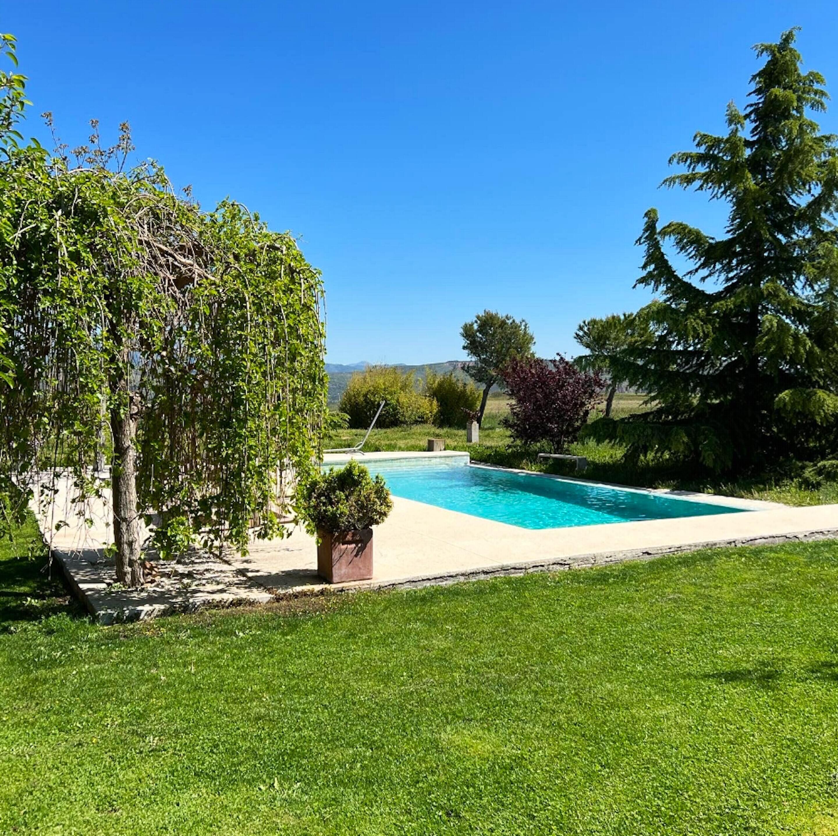 . Private swimming pool with lounges and natural lawn.