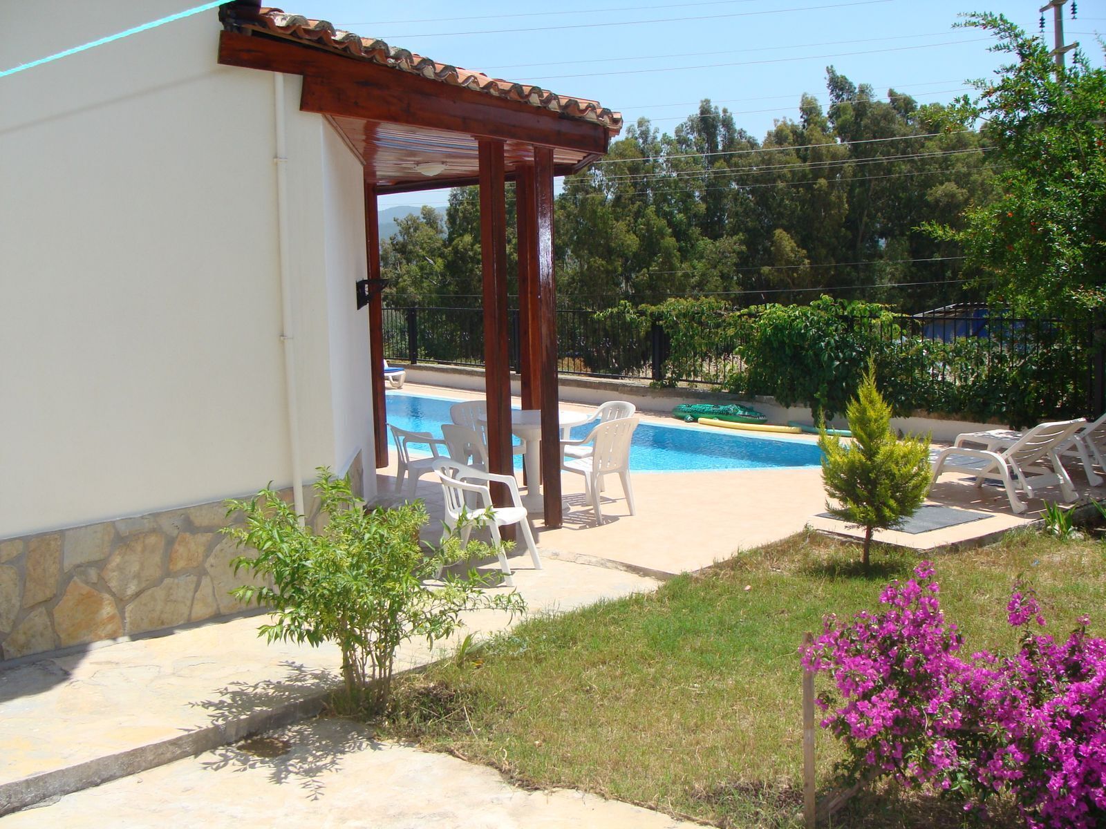 Bahçe : Havuz başında güneşlenme terası, 4 adet şezlong, güneş şemsiyesi, 4 kişilik masa ve sandalyeler sandalyeler, barbekü bulunmaktadır.