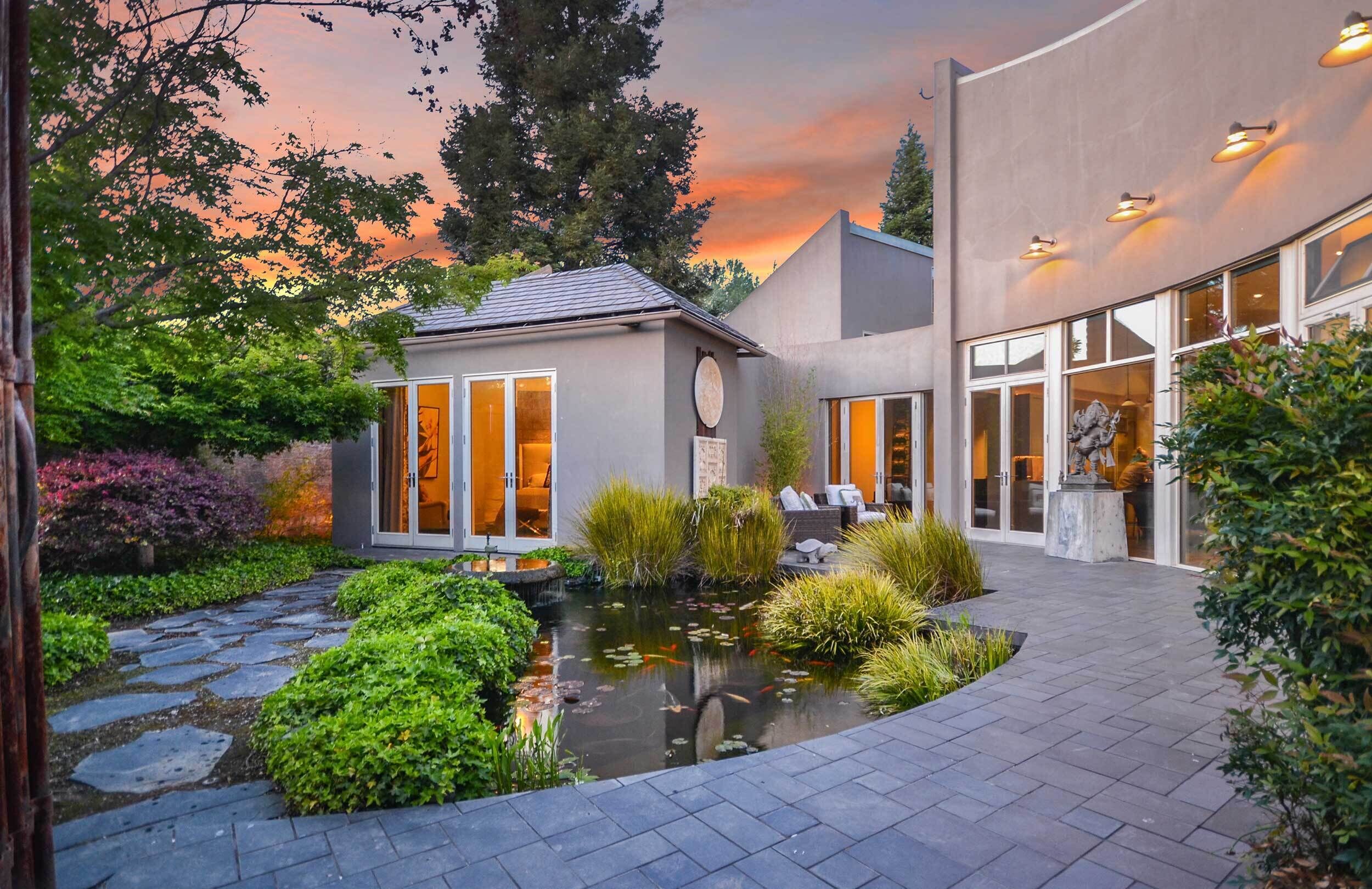 The outdoor grounds of this Wine Country vacation rental are exquisite. Acres upon acres of vineyards surround the buildings on three sides, unfolding in the distance like rows of corduroy. To access the front door, guests pass through a walled Japanese garden, complete with a koi pond, Japanese maples, and bubbling water features. Out back, manicured lawns and gardens give way to glorious rose bushes with buds in pink, red, yellow, and orange. There’s a Bocce court, a lap pool, and hot tub. There’s also 4,000 square feet of contiguous patio space and various forms of seating. Close your eyes and listen to the chirping birds and the leaves of the trees swaying in the wind. The true treasure of the Golden Retreat is privacy.