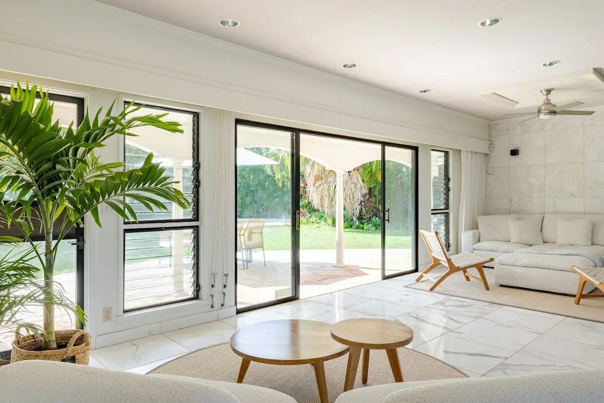 Inside, the main house features multiple airy living areas filled with natural light, including the main living room, which the owner affectionately calls the “Gateway to the Pool”—thanks to its seamless connection between indoor comfort and the outdoor lounging area.