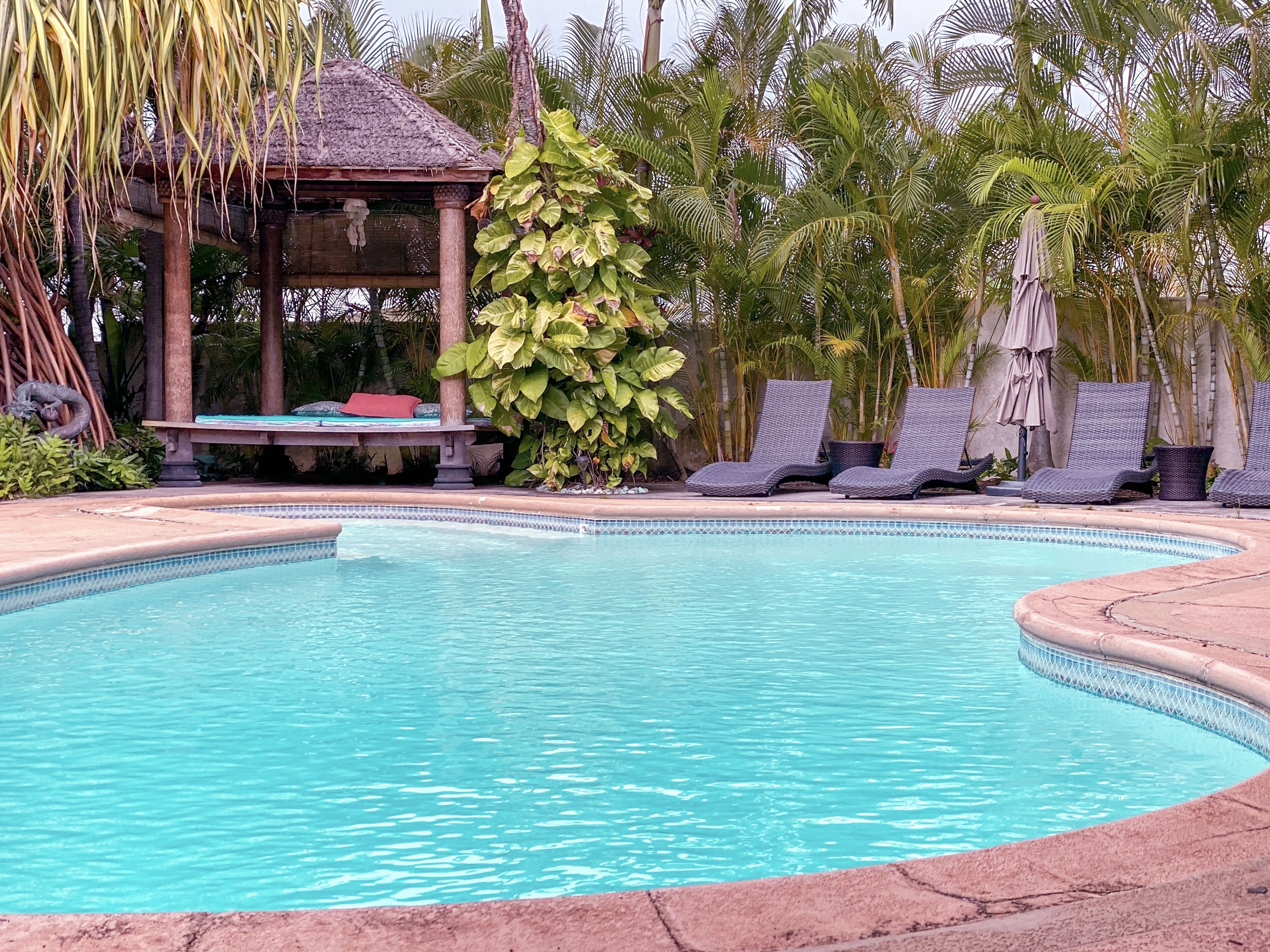 A mini resort tucked away in an upscale and peaceful neighborhood, this Villa is absolutely one of a kind! The entire Villa has just been exquisitely renovated with a swimming pool, Bali house, and waterfall. The landscaping is so immaculate, our guests rarely want to leave the property! This luxurious Villa has a huge backyard, free parking/wifi, wonderful natural lighting, central a/c, a large kitchen, lively entertainment room, and great ocean breezes throughout the space! Close to many beaches, hikes, supermarkets, shops, and much more!:)