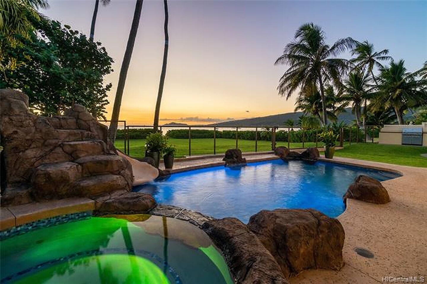 Our Beachfront Villa sits on a large private lot with a beautifully manicured lawn streching down to our sandy beach. Perfect for families and couples who enjoy a salt pool, pool slide and hot tub and AC throughout their accommodations. Experience spectacular sunsets every evening just a few minutes from Waikiki, the airport, restaurants, shopping and Costco.