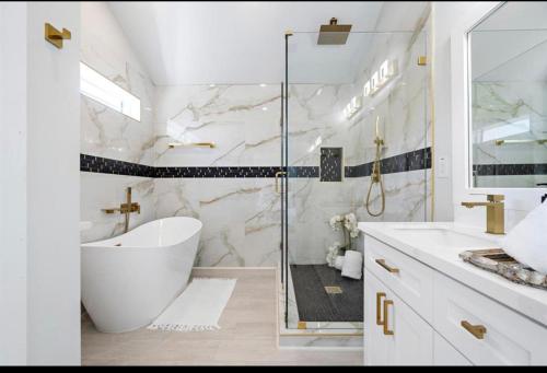 Luxurious primary bathroom with stand-up, walk-in shower and elegant tub