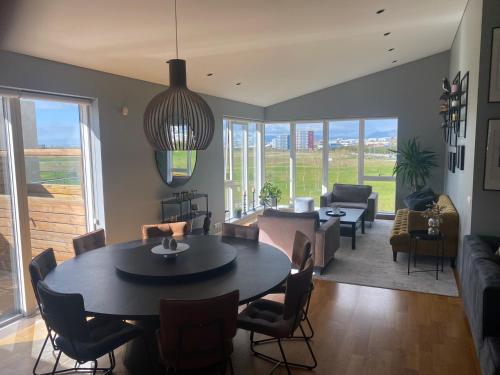 Hrossholt is a luxury, spacious, modern designed house on a secluded farm, with large windows and a peaceful terrace with large hot tub. Very private location. Just renovated, everything is brand new!