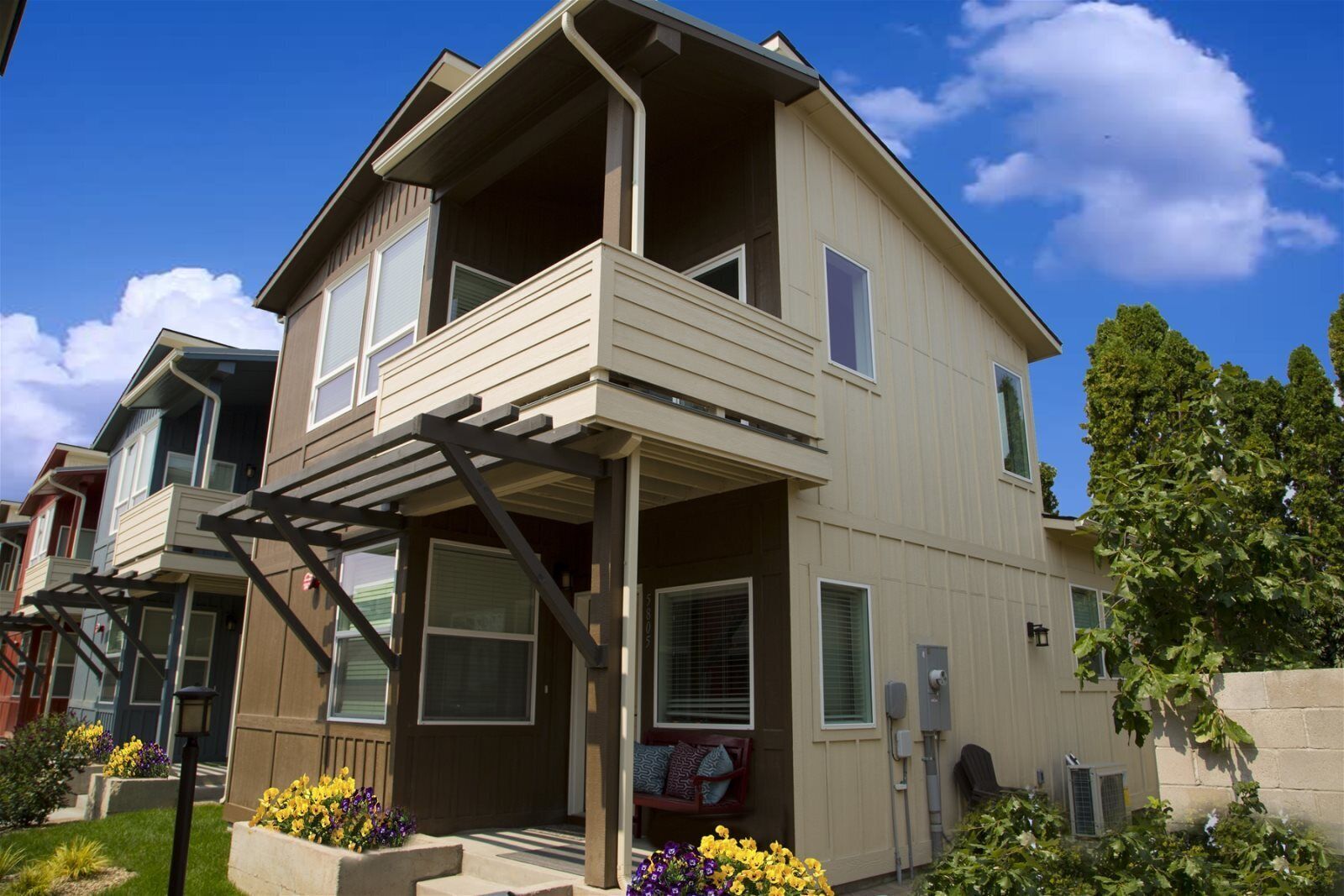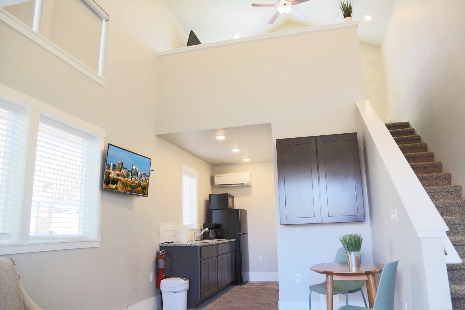 Welcome to the new Coffey St Villas, a pocket community! This close-in housing project is aimed at the working clientele who wants to get home to some peace and quiet in the midst of the hustle-bustle of the city! This BRAND NEW 1 bedroom/1 bathroom home will fill the bill for those who want to live closer to where they work thereby eliminating a long commute. There are 12 homes in this cluster, each with their own attached garage plus an extra garage to accommodate a second car or to use for storage. These homes surround a center park-like common area complete with sidewalks and landscaping that is sure to please those who like the feel of serenity that a garden like this would bring. The community is near to the Boise River Green Belt accessed at the Glenwood bridge! Shopping is close too, with Fred Meyers on the corner of Glenwood and Chinden! And nothing is nicer than to live near Expo Idaho! After a long day at the job, you can fall into bed for a great night's sleep; the bedroom is on the upper level loft with vaulted cealings and an open view to the first level with plenty of windows. The kitchen is equipped with a refrigerator, microwave, utinsels, silverware, and dish towels. There is also a coffee maker with coffee supplies, a toaster and a toaster oven. Long term or short term rentals are fine. The rental rate is dependant upon the length of stay. Pets are welcome upon approval; however, there is a refundable pet deposit. There is a TV on the first floor living area viewable from the kitchen, dining area and living area. There is also a TV in the upstairs bedroom loft.