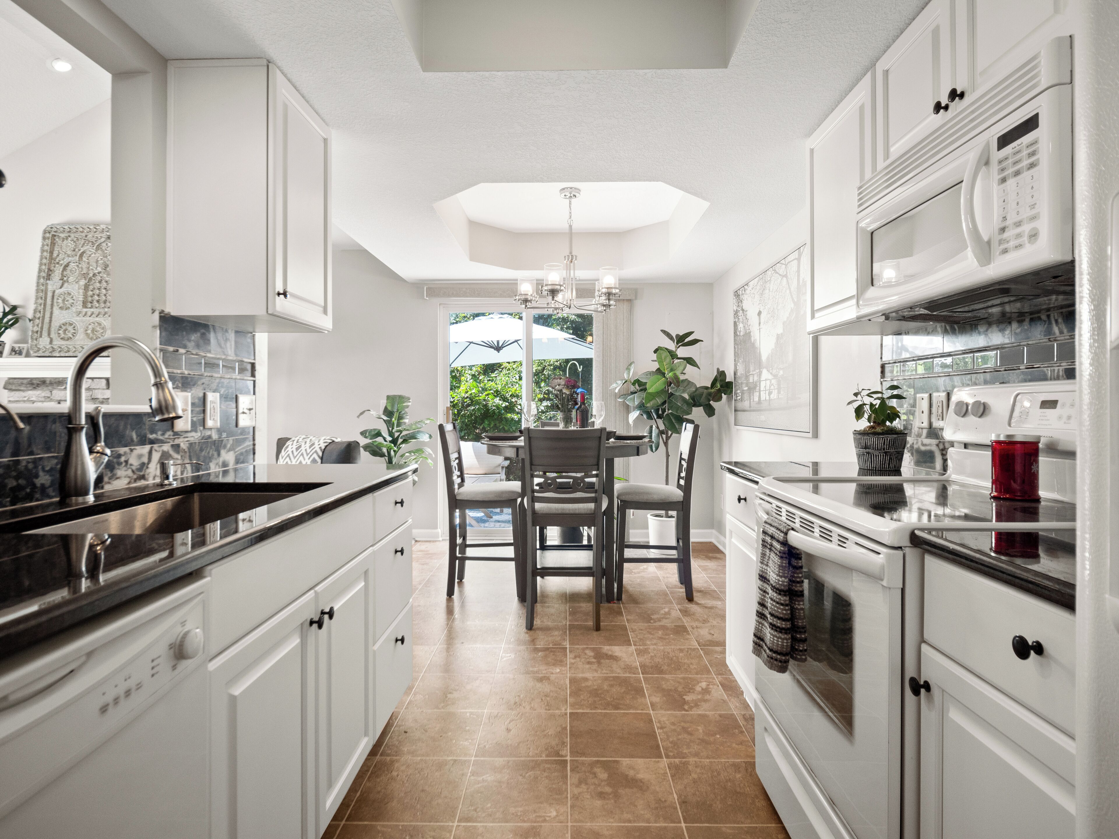 ・Kitchen appliances including a full size refrigerator/freezer, stovetop, oven, dishwasher, microwave, toaster, and blender.
