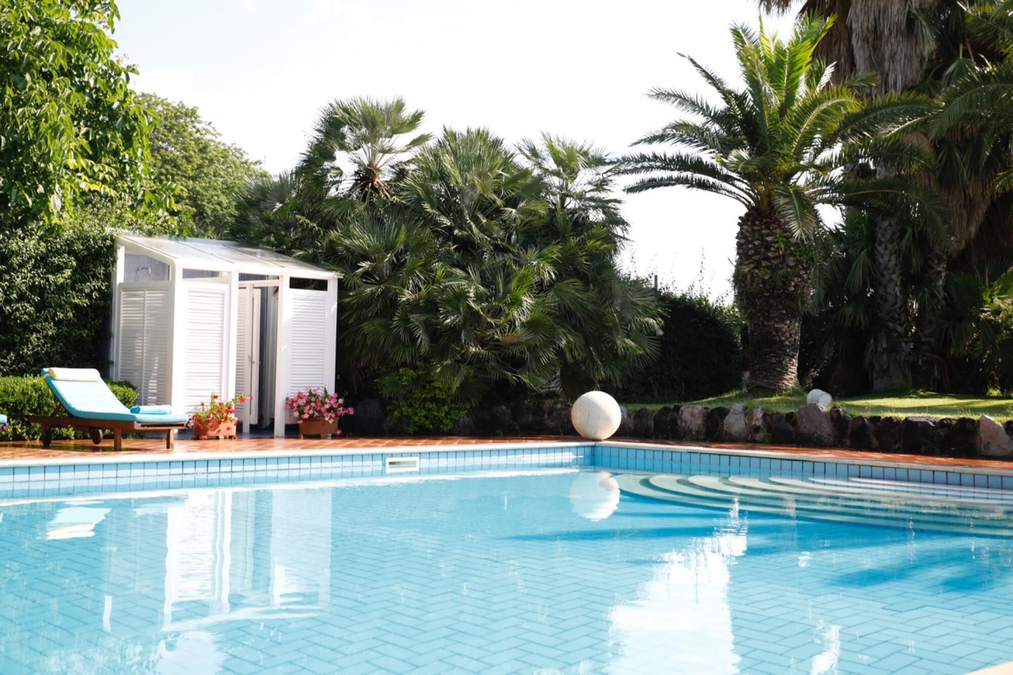 The pool is located next to the villa, on a terrace overlooking the sea; rectangular in shape, measuring 13 x 4 meters with a depth varying from 1 to 2 meters; covered in clear PVC; access by steps; chlorine purification; interior and perimeter lighting. The solarium is furnished with sun loungers, tables and a cold water shower. The wrought-iron gazebo houses a handcrafted lava stone table with Vietri ceramic inlays. The pool is open from the last Saturday in April to the last Saturday in October.