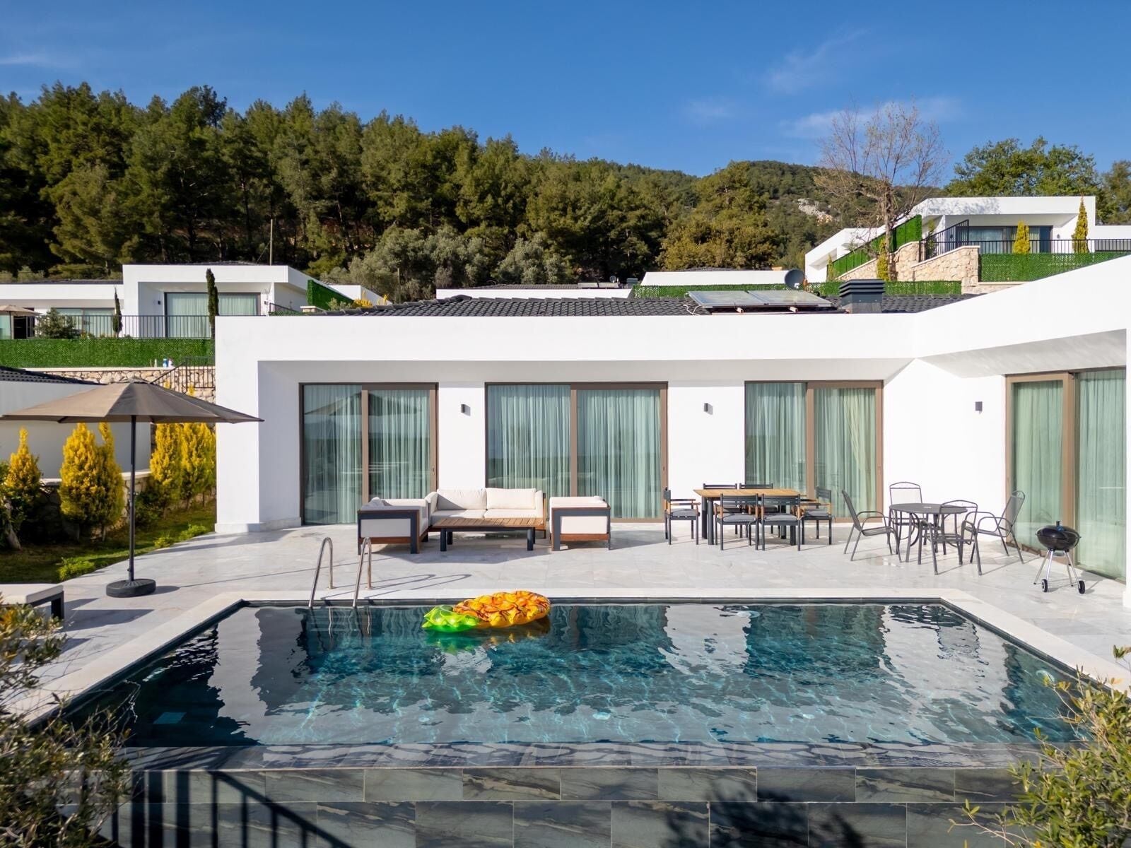 You wake up to a unique nature view and you can sip your coffee in silence. You can swim in your pool with beautiful sea and nature views. Our building makes you feel very comfortable with all its protection and offers a wonderful pleasure in nature.