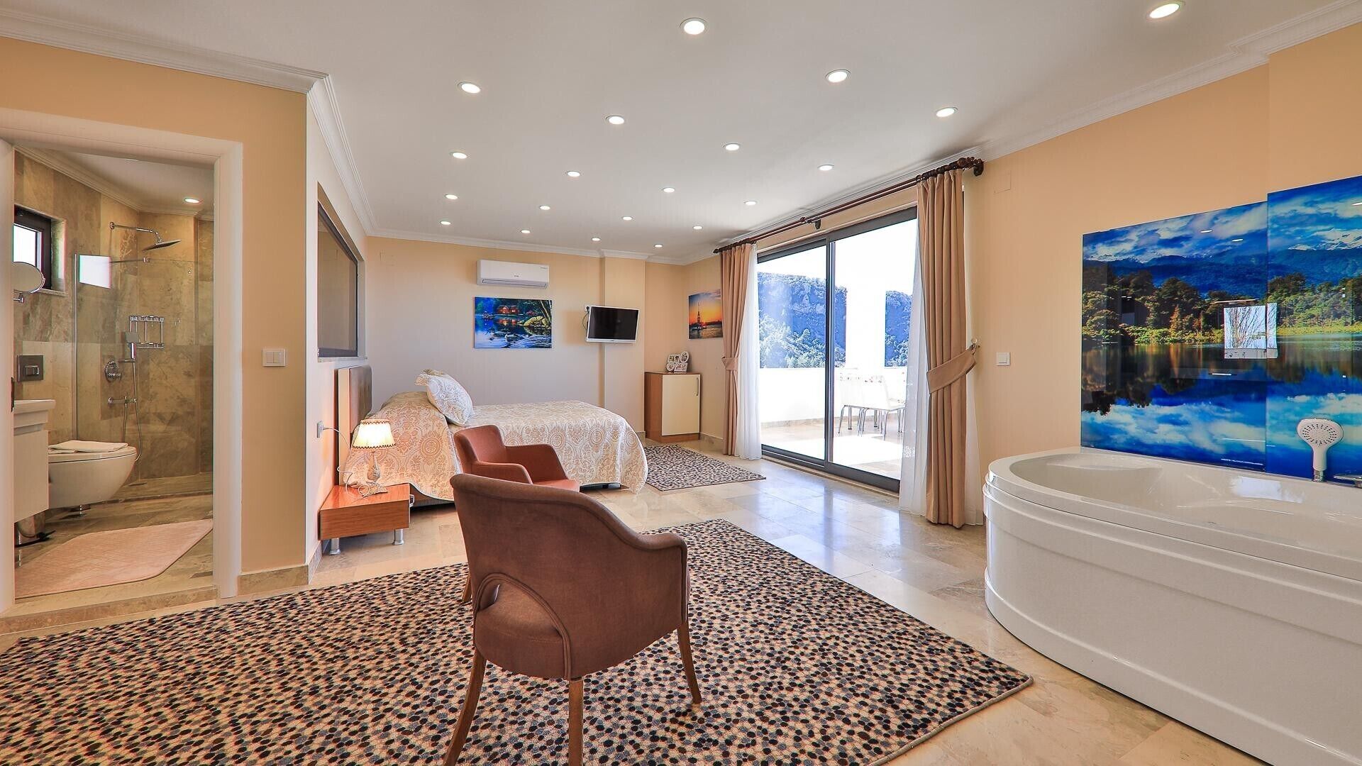 20 miles from Lycian Rock Cemetery in Kalkan, infinity wild features accommodations with access to a fitness room, public bath, and open-air bath. This beachfront property offers access to table tennis, free private parking, and free Wifi. Guests can use the spa and wellness center with a sauna, hot tub, and hammam, as well as an infinity pool. Offering direct access to a balcony with mountain views, the spacious air-conditioned villa consists of 2 bedrooms. Featuring a terrace with sea views, this villa also comes with a satellite flat-screen TV, a well-equipped kitchen with a dishwasher, an oven, and a microwave, as well as 2 bathrooms with a hot tub and bathrobes. For added privacy, the accommodation has a private entrance and soundproofing. For those times when you'd rather not eat out, you can cook on the barbecue. The villa has a picnic area where you can spend the day outdoors. Saklikent National Park is 18 miles from the villa, while Saklikent is 19 miles from the property.