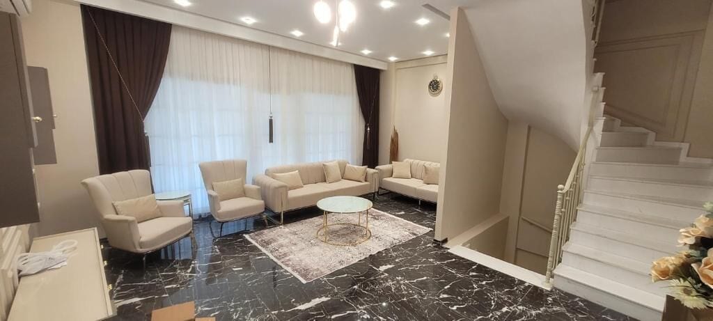 Welcome to our brand new stylish bright modern free standing private home in the heart of Beylerbeyi! Situated perfectly along the water with close access to the bridge. Our 3 floor villa has private garden space and 1 parking spot available. With an open space living room and fully equipped kitchen. A tv sitting area with an office space. Comes with 3 beds and 3 full bathrooms, air-conditioning and wifi. This home is the perfect home away from home for all guests to enjoy!