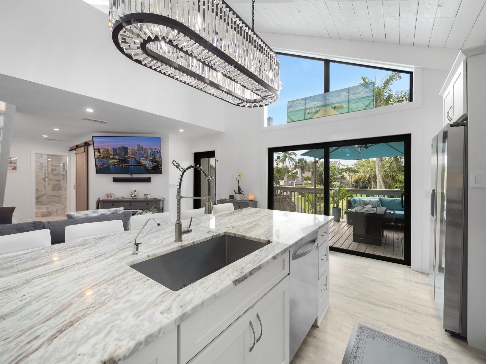 Your month-long journey at this villa starts with its striking design, blending modern amenities with cozy, beach-inspired decor. Each room boasts panoramic windows that frame the lush Florida landscape and invite natural light to flood the space, creating a warm and welcoming atmosphere.