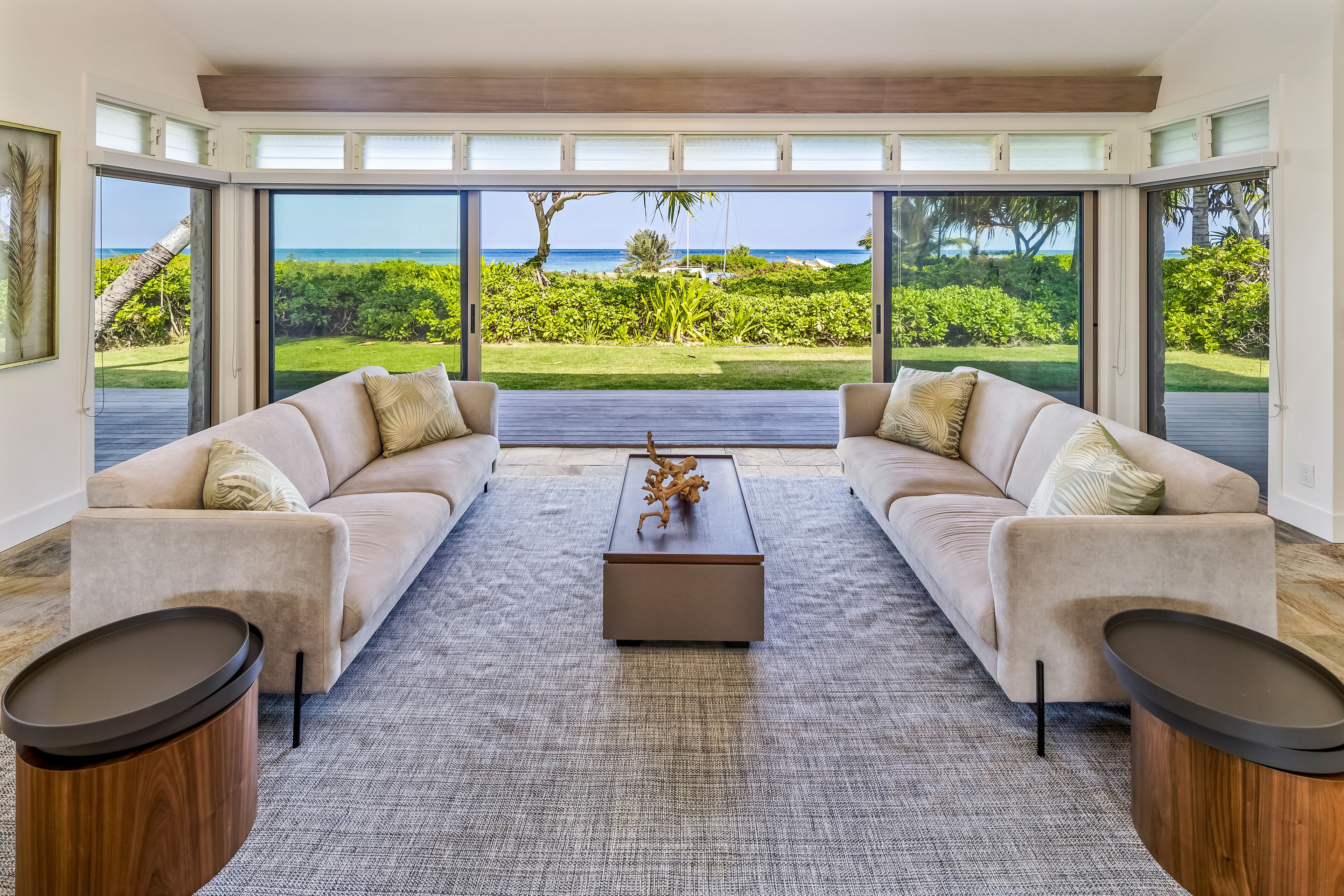The spacious and open-air design overlooking the crystal clear blue waters of Oahu’s eastern shore makes this beachfront villa aptly fit for entertaining and is ideal for a family reunion or an escape to paradise with a group of friends. This villa is not equipped with air conditioning, but thanks to the tradewinds over the ocean on the eastern side and ceiling fans throughout, you’ll be cool, comfortable and relaxed. Being on the windward side of Oahu with a multitude of sliding doors and windows throughout, the home is breezy thanks to the soft winds blowing in from over the ocean.