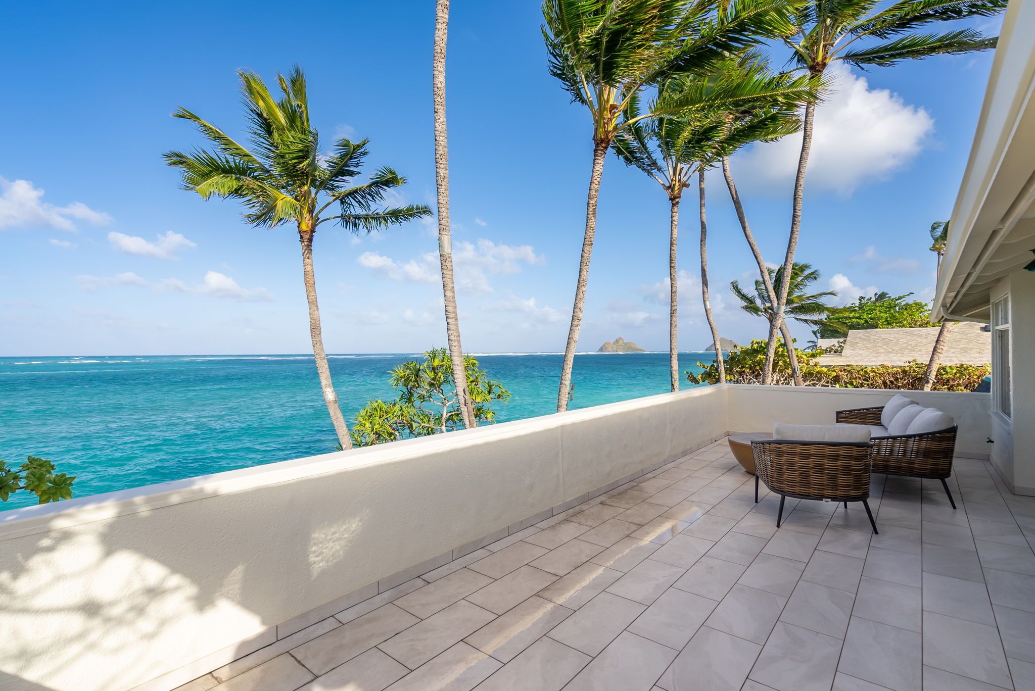 This gorgeous 5 bedroom, 4.5 bathroom, gated oceanfront villa was built in 1918 and has just been fully remodeled with an open, contemporary beach house feel while still honoring the original architecture of the home. In the renovation we revealed beautiful arches within, expanded the gourmet kitchen with all new appliances, a coffee bar and wine fridge. Saltilo tile and wood flooring bring a Mediterranean feel. Every bedroom has a view of the picturesque ocean and world renowned Mokulua islands. The open living space, and an expansive front entry and back yard are perfect for families and large groups.The dining room is located on the lanai overlooking the ocean for indoor/outdoor entertaining at its best. The home is decorated in vibrant color themes complimenting the natural surroundings. Local art throughout the home add a special island feel. The back yard has an outdoor bar, bbq, hot tub, shower, and lounge area.