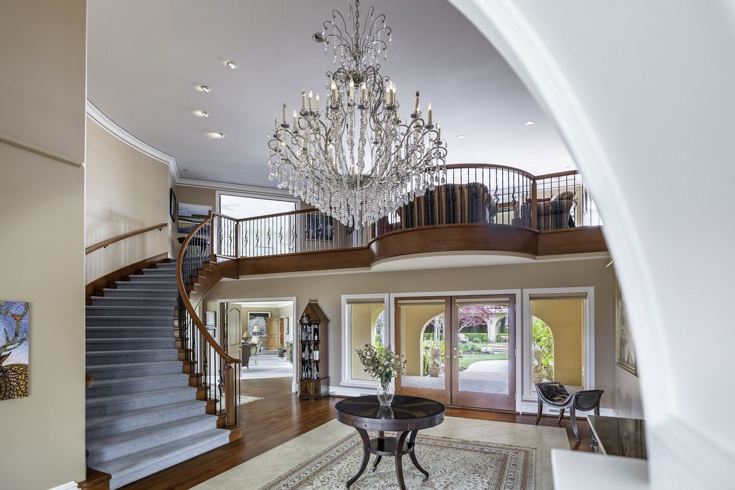 Elegant foyer and large living room with 16-ft patio doors opening to a covered lakeview deck