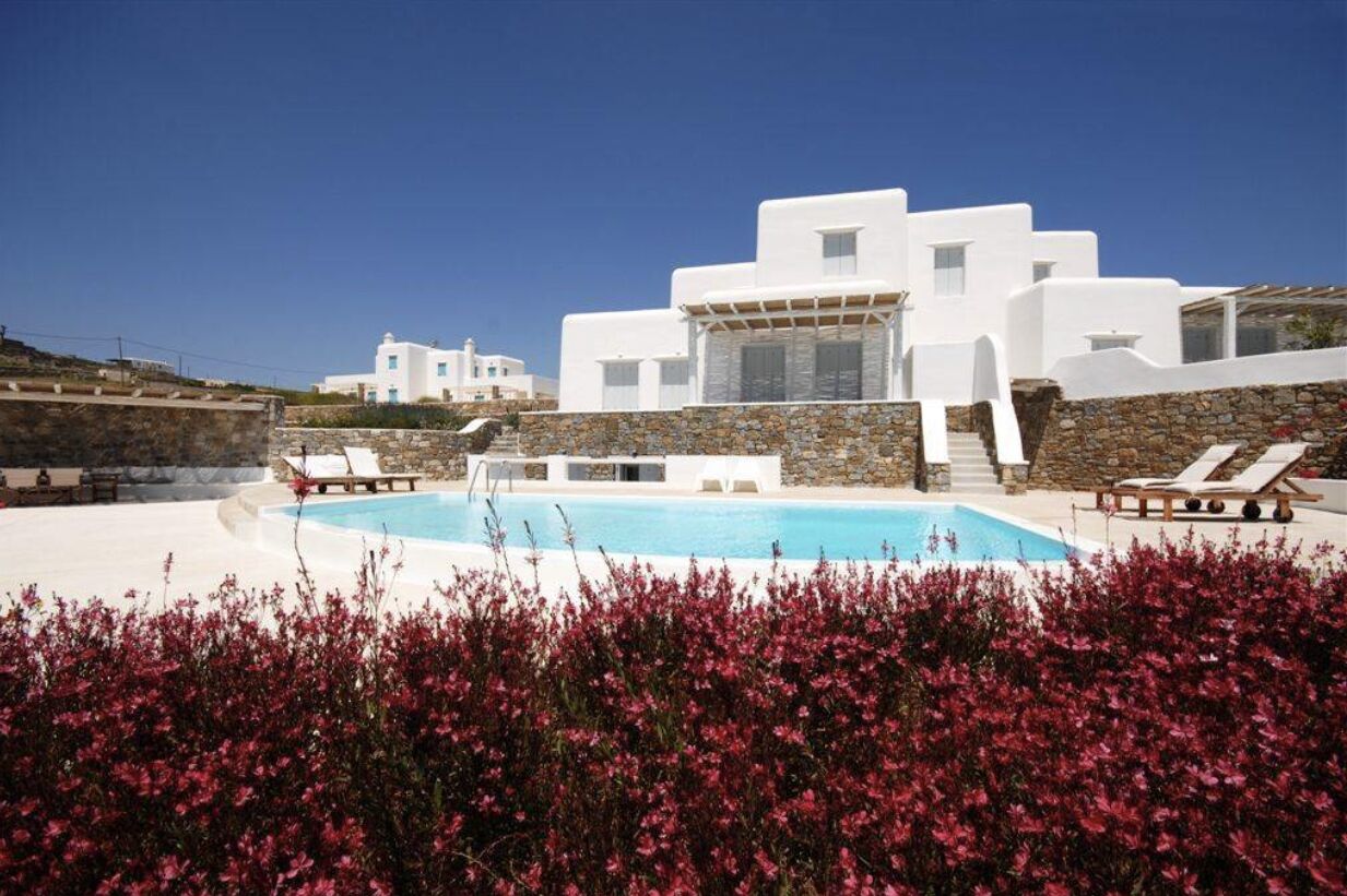The villa enjoys a privileged position with extensive sea view over the Aegean Sea and the northern coast of the island, which unveils the true beauty of Mykonos Greece original landscapes. It is ten minutes away from Mykonos town and near to island's cosmopolitan attractions.