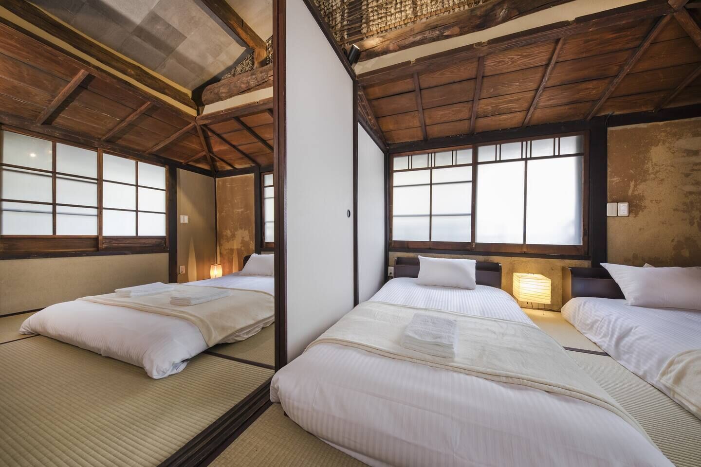 With sleek white walls, a free open mezzanine style layout, and plenty of windows to allow natural light to flood in, Tsuru Kame is a spacious home that doesn’t compromise coziness for style. This meticulously renovated machiya has been crafted to allow guests to retain privacy while also feeling a sense of airiness and flow. With three bedrooms, two living spaces, and two kitchen and dining areas, this eight-person-capacity home is the ideal choice for those on the hunt for a communal-style space for larger traveling groups and families.