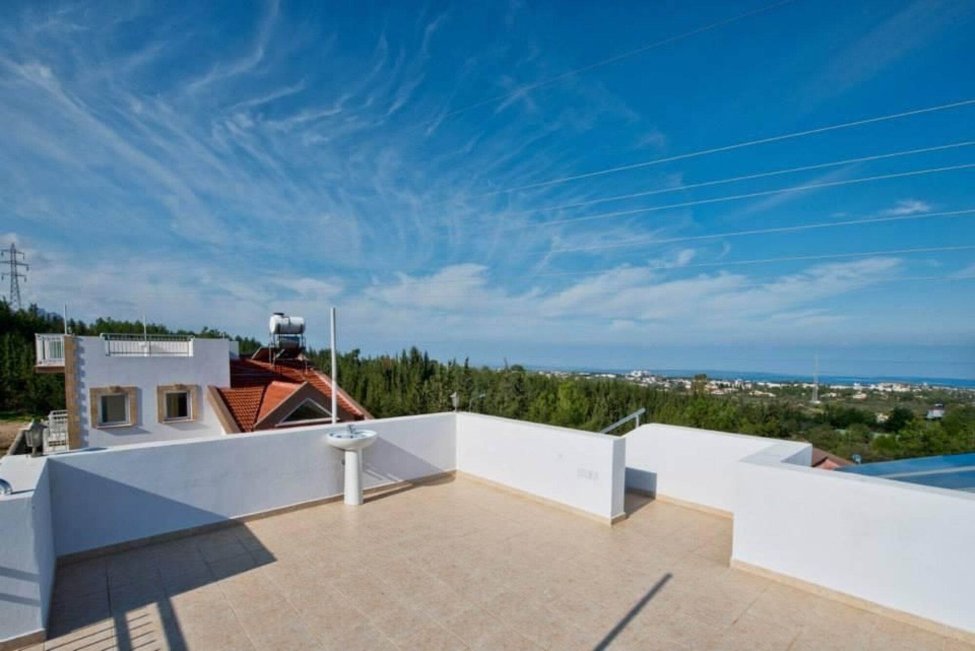 Azure is a beautiful modern villa decorated to a high standard. The sitting room has quadruple aspect, which maximises the natural light and offers cross ventilation. There are five patio doors which all lead out onto terraces. An open fire place and travertine floor which both compliment the ground floor. All 3 bedrooms are on the first floor. (1 x King with ensuite / 1 x Double / 1 x Twin). Also the family bathroom (with a bath). There is a door on the landing leading to the roof terrace which offers an alternative sun bathing area, or better still an evening drink. To the west is the view of the remains of the ancient Bellepais Abbey, said to be the most impressive Gothic building in Cyprus. A fantastic sight when illuminated in the evening.