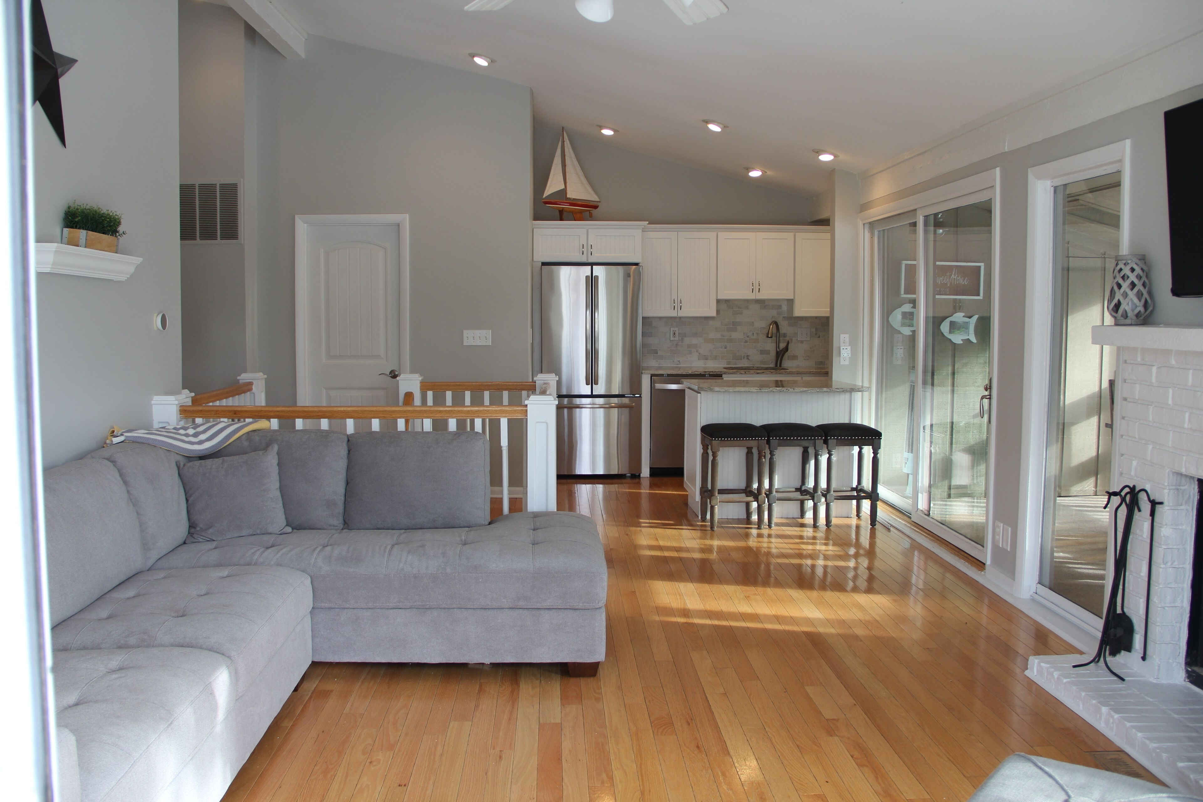 The design is clean, fresh and cheerful. Cathedral ceilings. Brand new white washed wooden floors through out for clean low allergen environment. Pretty china and glass cabinet full of wine glasses waiting for the vacation to start....