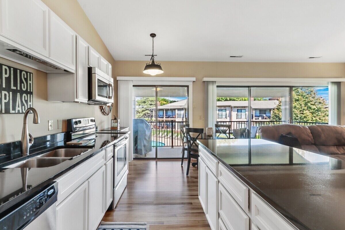 The Abbey Villas boast clean, modern living, a large association pool, and a prime location at the peaceful West end of Geneva Lake. This first-floor unit is perfect for family groups looking for all the comforts of home in a resort-like setting. Spend mornings and evenings relaxing on your private patio, and easily set off on foot to hit the beach, rent a boat, and enjoy local restaurants. Downtown Lake Geneva shopping, wining and dining are just a twenty minute ride down South Lake shore drive. Don't feel like going out to dinner every night? The fully equipped kitchen and dining area have you covered. Located steps from popular wedding venue The Abbey Resort, this retreat serves as an incredibly convenient option for groups looking to be close to the celebration with a bit more privacy and room to spread out than the hotel has to offer.