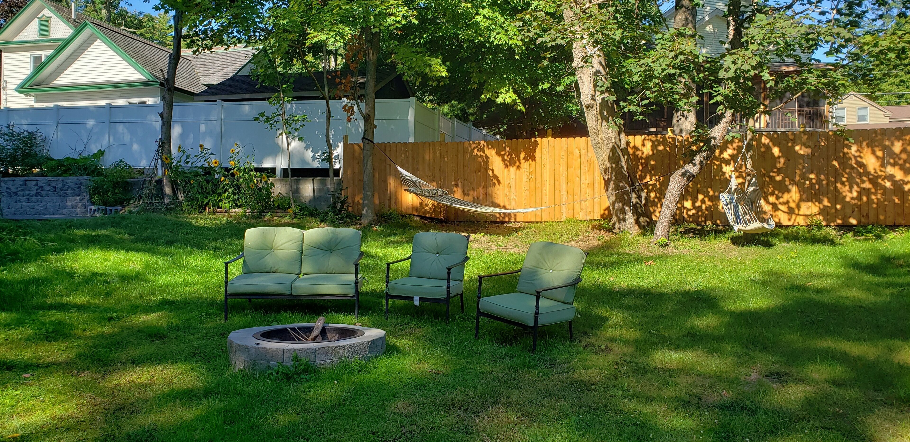Villa Maria's backyard has a lawn area with a fire pit, hammock, and two raised veggie beds. We have also added a badminton/volleyball net to the backyard lawn area.