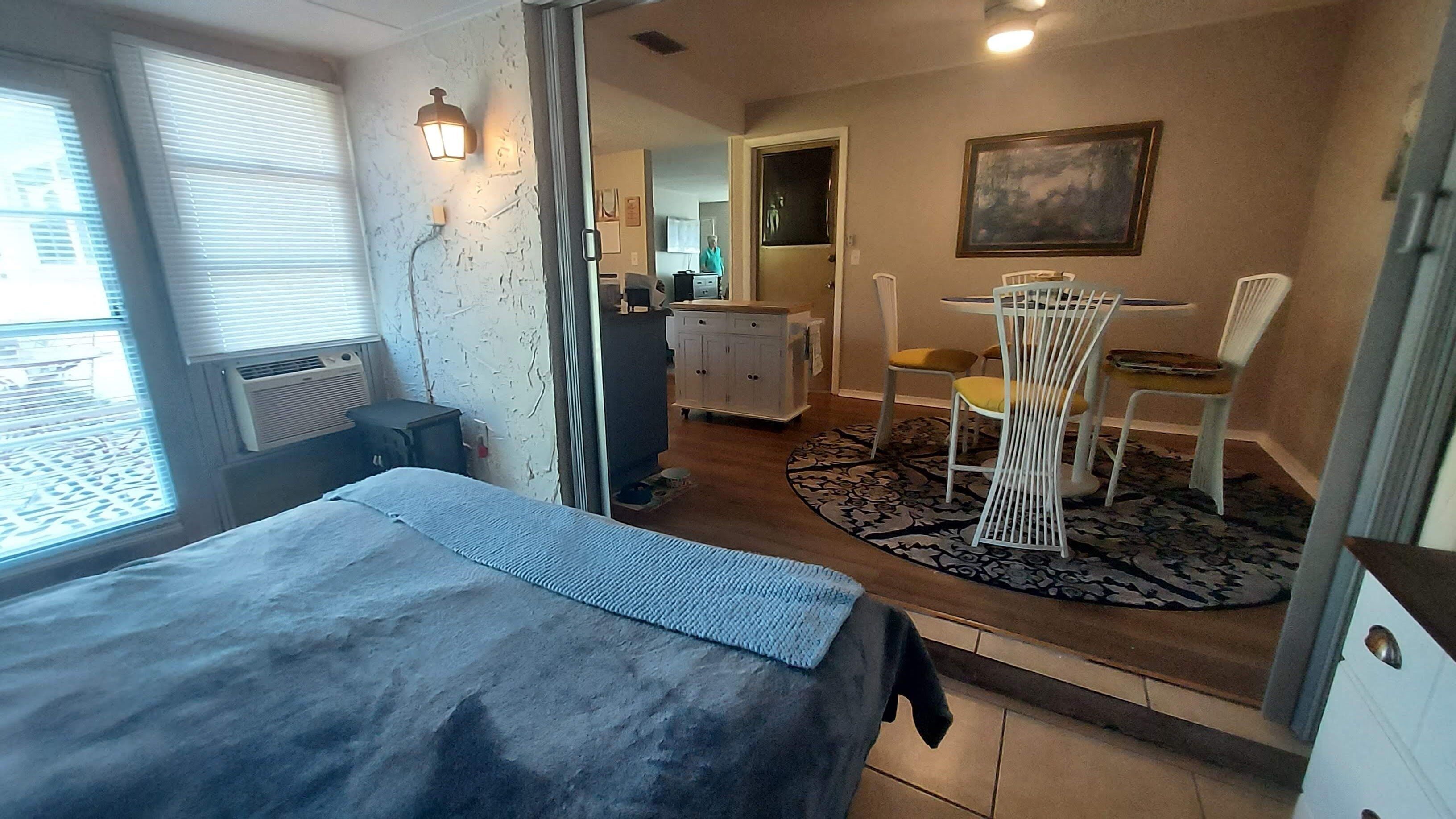 Spacious, tastefully furnished Florida Villa ( single story condo). Large queen one bedroom. As a bonus the fully enclosed and air conditioned Florida/sun room has a queen sized tempurpedic type American Leather sofa sleeper (no bars) and dresser. Master bath with tub/shower as well as a half bath - which includes a large vanity . New granite counter-tops, refrigerator and dishwasher, AC, and fresh paint. Enjoy your morning coffee on the backyard patio. Relax in a quiet neighborhood on a dead-end street and walk less than a block to four restaurants: Thai, Cuban, Mexican and German. All utilities are included. Near the bus stop, hospitals, Largo Mall. Six miles to Indian Rocks Beach and 7 miles to Clearwater Beach. Bike the Pinellas Trail, which runs the length of the county, or walk around John Taylor Lake; both just 3 miles away. Highland Recreation Center is directly behind the complex and has a beautiful walking trail around a pond, exercise classes, a pool, and tennis/pickleball courts. The villa complex has a pool on the property.