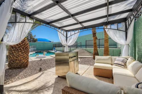 Amazing heated pool and private Hot tub 3br in heart of LV is a recently renovated villa in Las Vegas where guests can make the most of the garden and bar. This property offers a private pool, free Wifi, and free private parking. The villa has an outdoor fireplace and a hot tub. Offering direct access to a balcony with garden views, the air-conditioned villa consists of 3 bedrooms. Featuring a terrace with mountain views, this villa also includes a cable flat-screen TV, a well-equipped kitchen with a dishwasher, an oven, and a microwave, as well as 2 bathrooms with a hot tub and bathrobes. This villa is allergy-free and non-smoking. The villa has a picnic area where you can spend the day outdoors. Bellagio Fountains is 7.4 miles from the villa, while Forum Shops at Caesar’s Palace is 7.5 miles from the property. Harry Reid International Airport is 8.7 miles away.