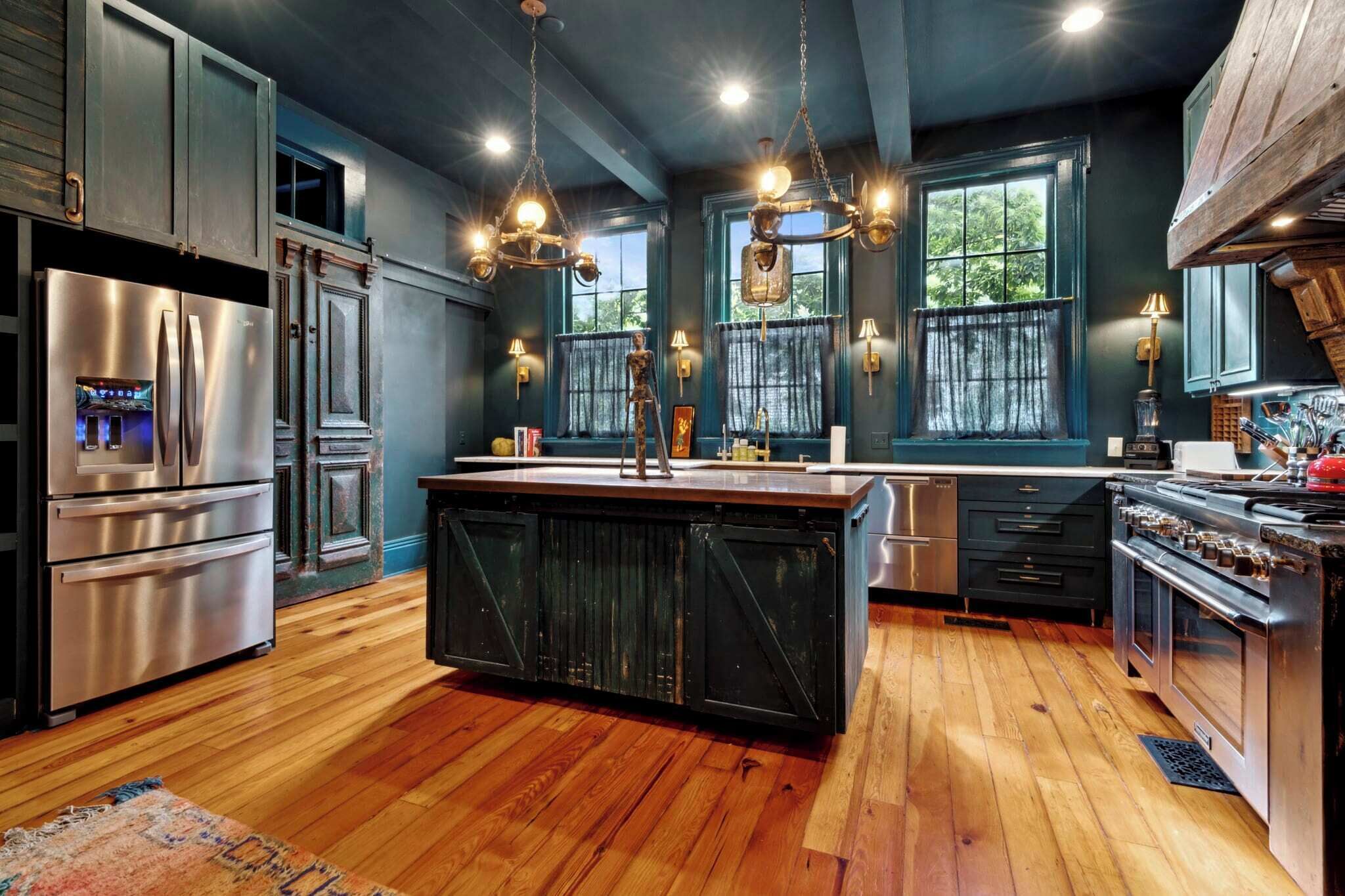 The 5br/4.5ba house spanning over 5,000 square feet offers a vast variety of social and entertainment spaces ranging from an adjacent former welding shop turned garage and commercial kitchen over a Victorian grand ballroom to a sprawling courtyard with large pool.