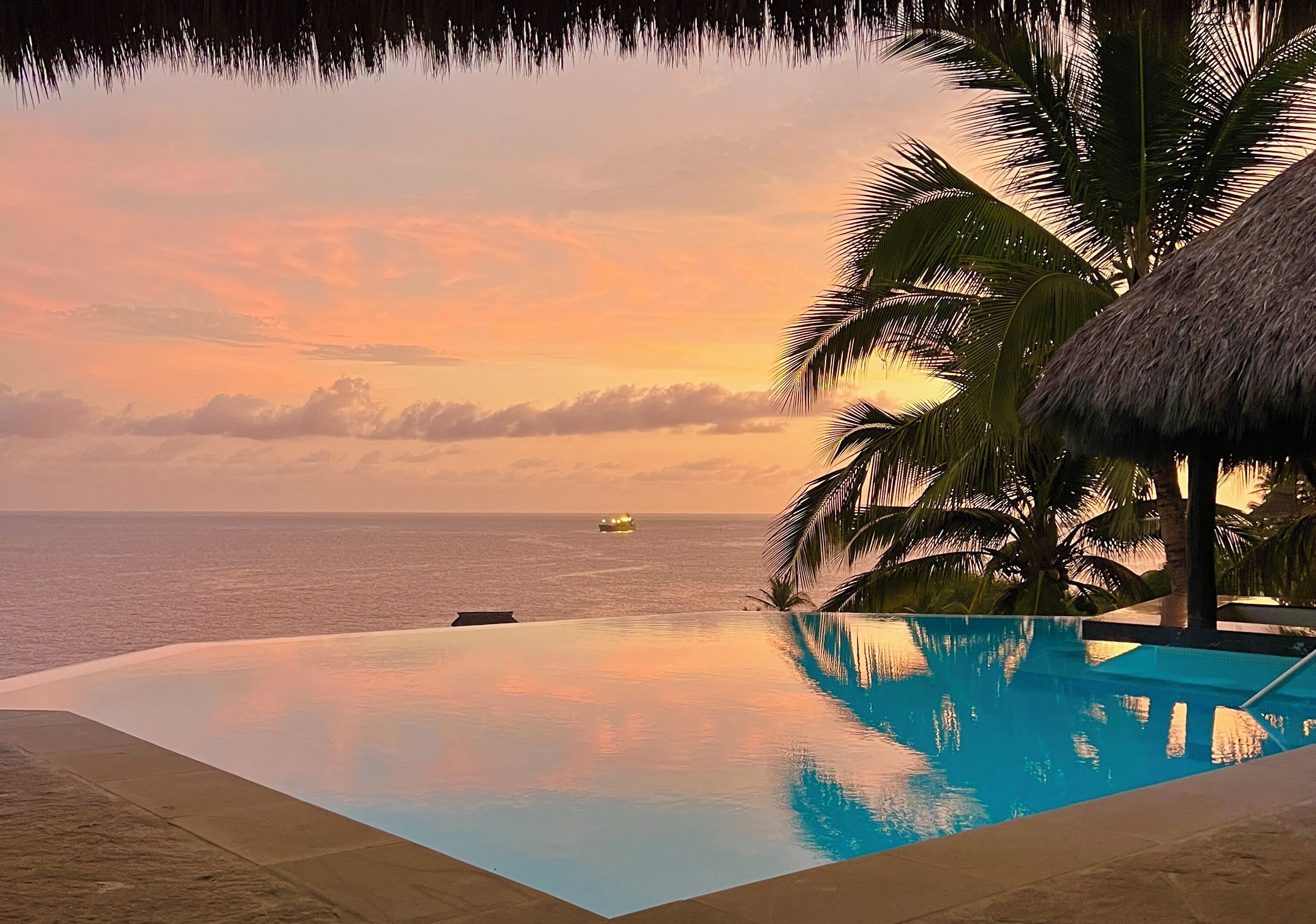 The third level features a thatch-roofed palapa bar with expansive views of the ocean, the mountains and the jungle. From this perspective, you can actually see the sunrise and the sunset without ever moving a step. The sunset bar provides a great place for meals, for cocktails or even a relaxing massage.