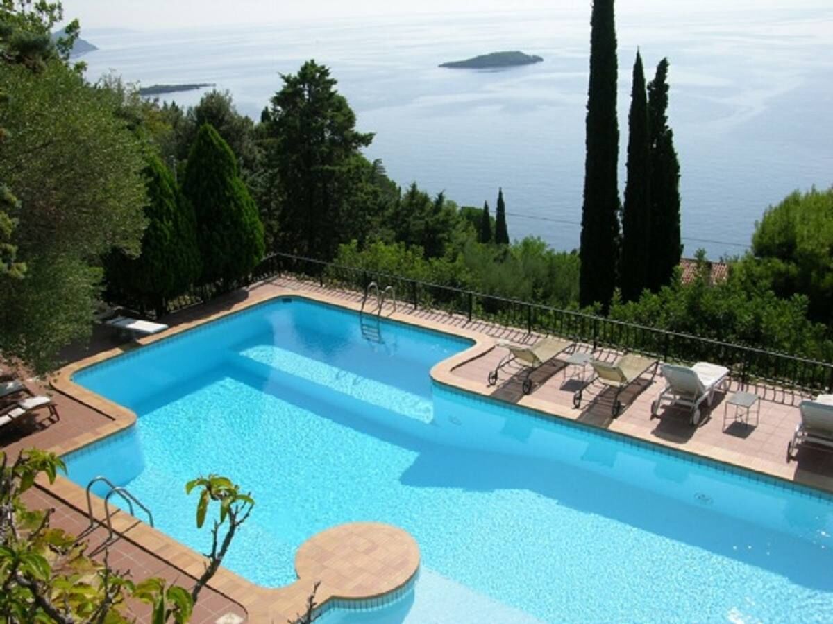 The swimming pool is 6.5 meters (21 feet) large by 12.5 meters (41 feet) long, 2.3 meters (7.5 feet) deep. The swimming pool has an oval shape. It is an infinity pool and is filled with salt water. The area is equipped with deck chairs and sun loungers. By the pool you will also find a bathroom which is equipped with a washbasin and a toilet. From the swimming pool you will enjoy a fascinating view of the sea and of the coastline. The pool is open from mid-May until the end of October.