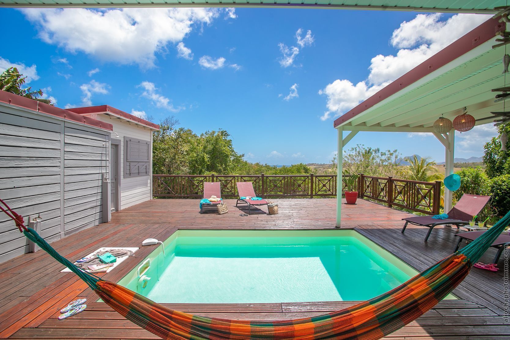 Charming villa of full foot open to the view of the sea and Diamond Rock and Morne Larcher. Bright and airy, it is designed and equipped to enjoy the vast spaces inside and life outside: veranda, Ipe deck around the pool, gazebo terrace, garden. To live there: good breakfast on the sunny veranda; a dip in the pool at the right temperature; bath lying on sun loungers with bright colors; evening drink under the gazebo in waves ... The pleasure of outdoor shower to rinse off after the sea. The happiness of a lying in the hammock reading or a nap in the cool of the room at the sight of the hot pink bougainvillea.