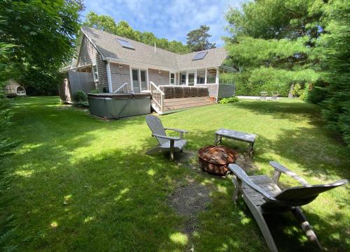 Connected via a breezeway, the in-law section offers three additional bedrooms, two baths, a spacious living room, and a fully-equipped kitchen, providing both privacy and convenience. Each section features its own separate patio, allowing for intimate gatherings or quiet moments amidst the Cape Cod breeze. Built in 2024, this immaculate oasis exudes contemporary comfort and timeless charm, offering three beautifully appointed bedrooms, two elegant bathrooms, and a sleek kitchen ready for your culinary adventures. Your stay is further enhanced by amenities like a washer and dryer, fire pit, and barbecue.