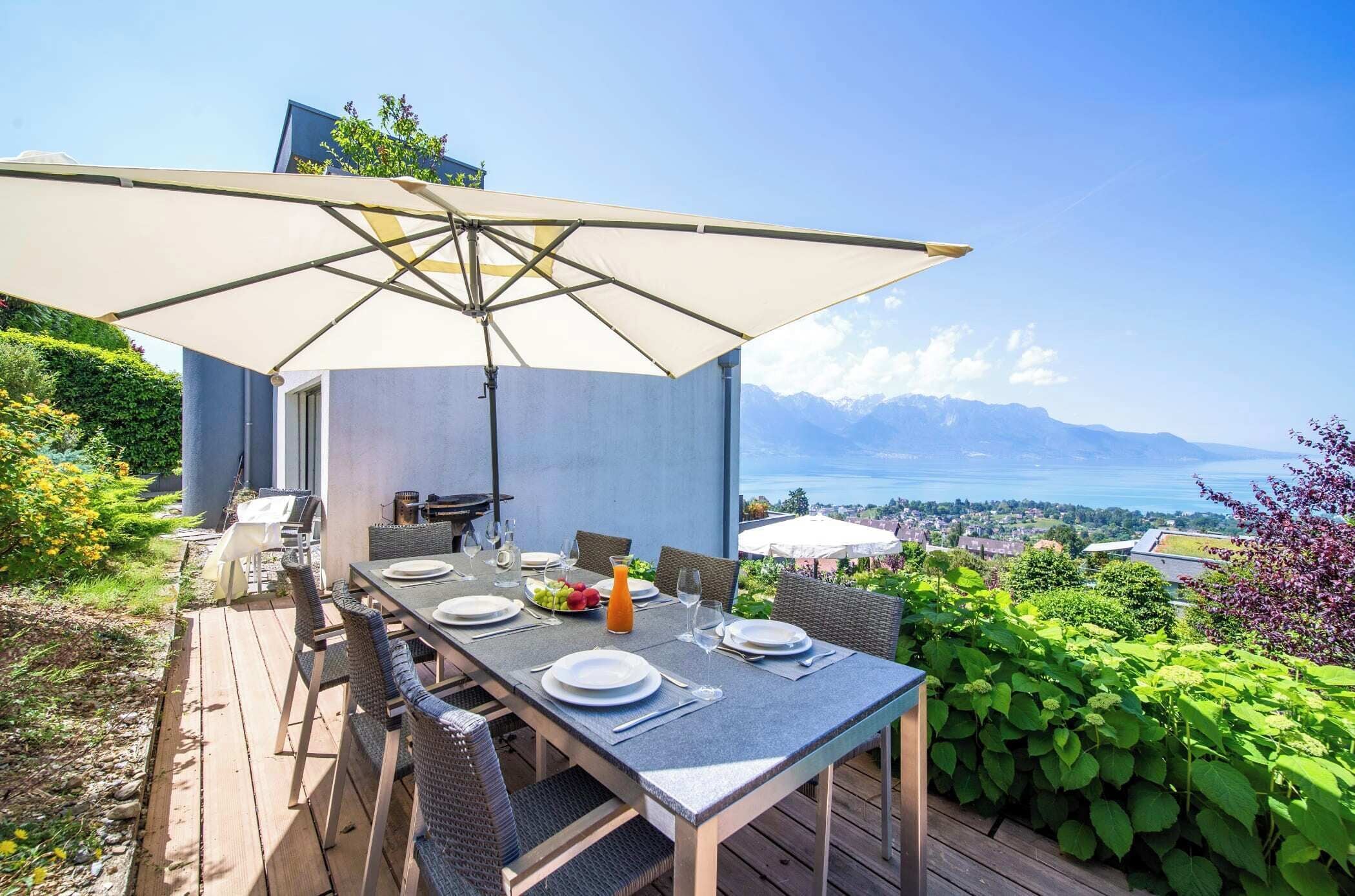 Experience your dream vacation in style at this stunning and spacious villa, situated in the tranquil and secure surroundings of Montreux on the Swiss Riviera. Boasting panoramic views of the region, this three-story villa spans 220 square meters and features three separate bedrooms, 2.5 bathrooms, a large open kitchen equipped with all the modern amenities, and a stylish living room designed with families in mind. Outside, a large private garden offers the perfect space for relaxation, complete with a garden table for those unforgettable summer dinners and ample room for kids to play.