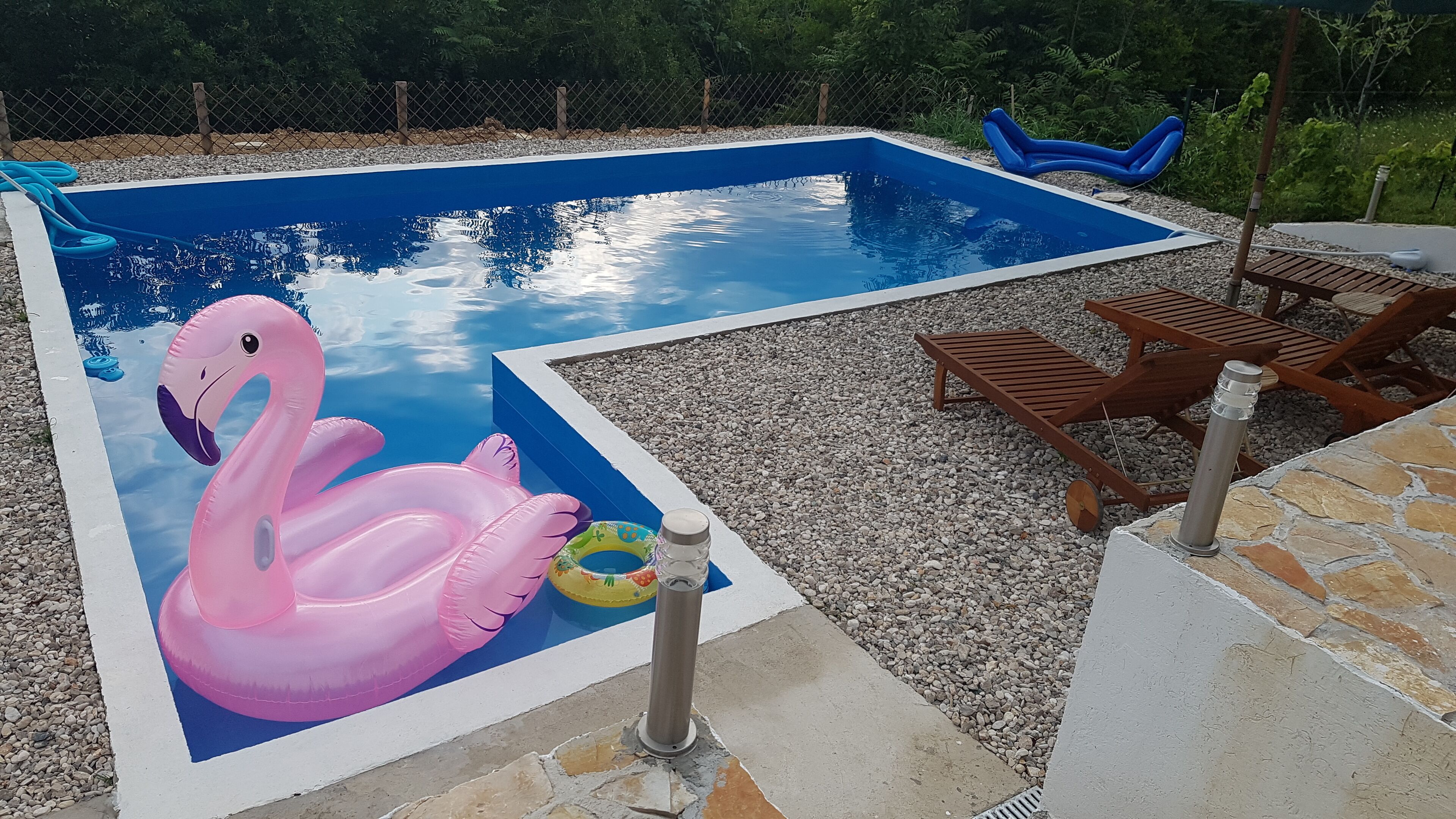 There is a pool with sun beds, garden furniture, and an outdoor grill. The only neighbors you can encounter are domestic animals that walk freely around the villa; goats, pigs, rabbits and dogs.
