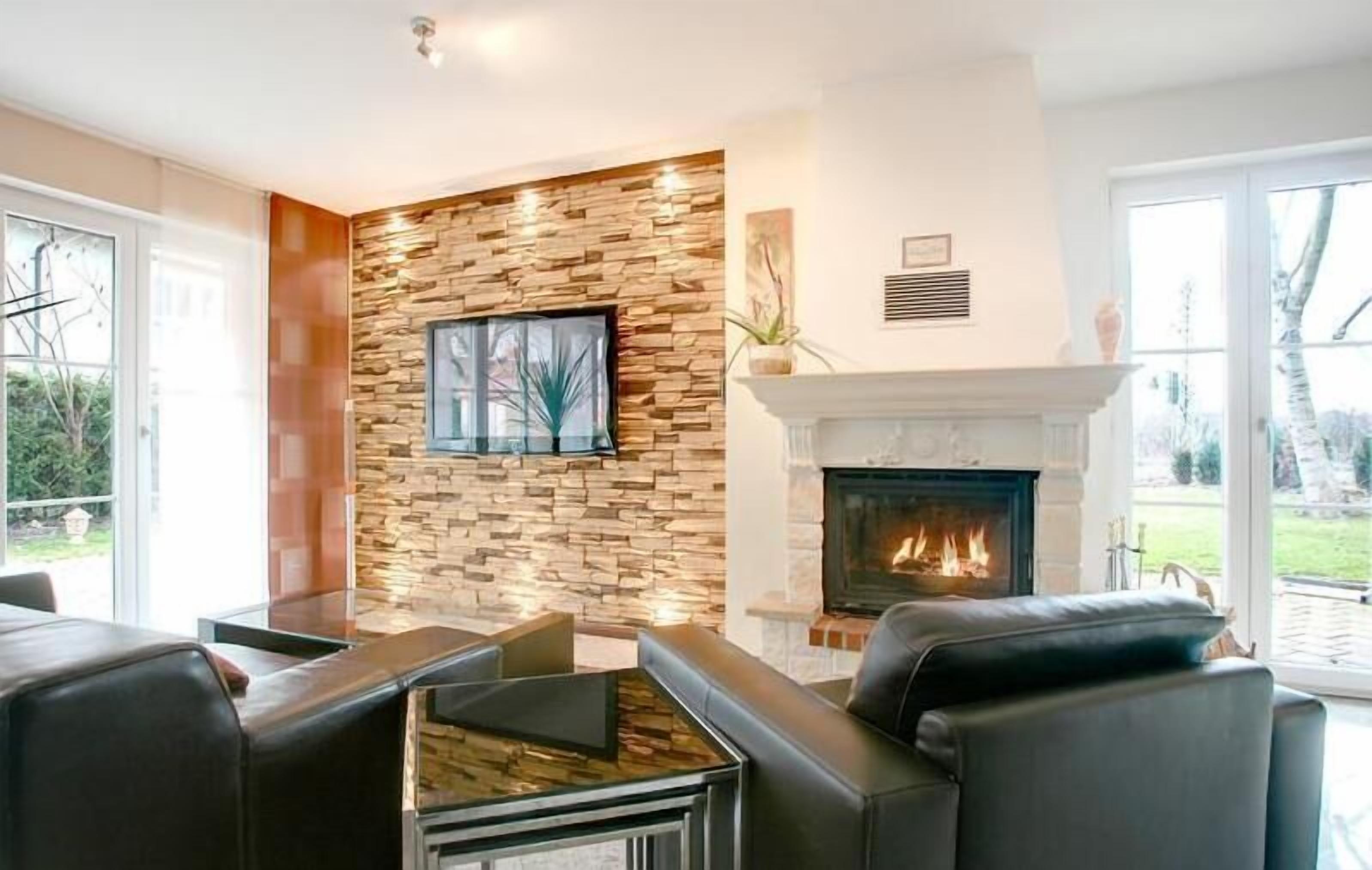 - The living and dining area on the ground floor, which is almost 70m² (750 sf) in total, offers a comfortable sofa/seating area with a 65-inch Smart TV and a fireplace that can be used all year round