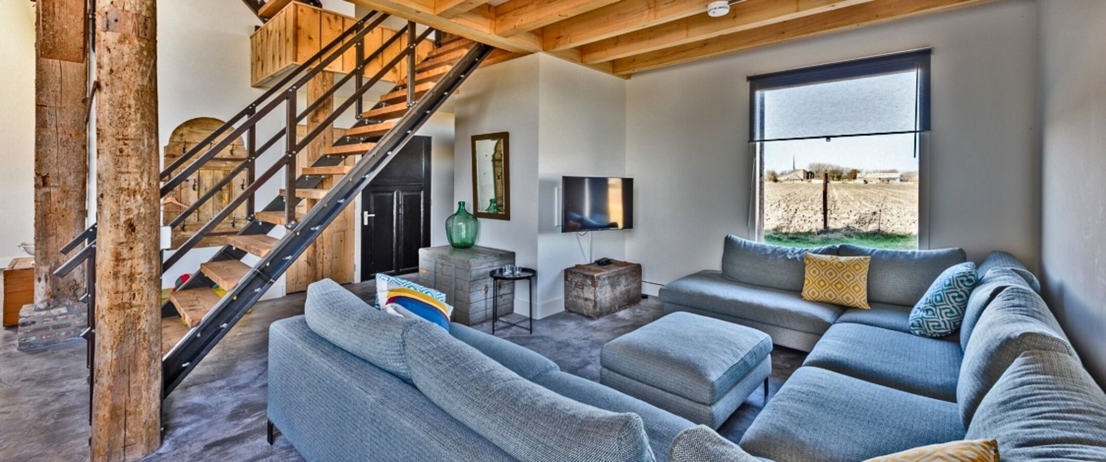Het linker deel van de schuur (Beach Barn) is met recht een exclusieve moderne vakantiewoning te noemen. Achter de oude mannendeuren zit een prachtige glazen pui verborgen. Hierdoor heeft u vanuit de ruime woonkamer een prachtig uitzicht over het prachtige Zeeuwse landschap. Deze woonkamer heeft verschillende zithoeken: rondom de houtkachel en bij de televisie of 'gewoon' om te chillen.