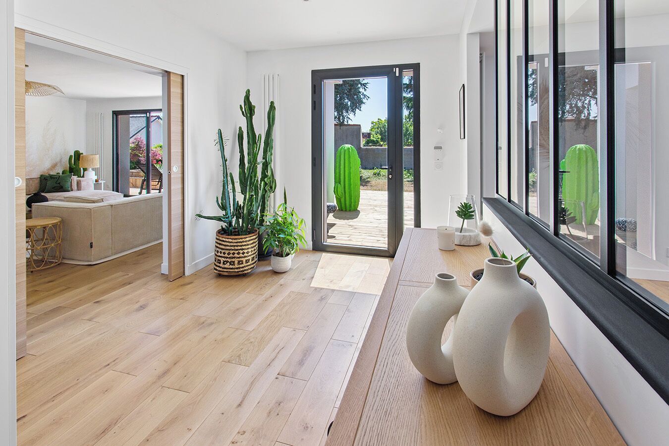 En période de beau temps, ouvrez toutes les baies vitrées et profitez au mieux des espaces offerts en brisant la frontière du dedans-dehors, détendez-vous au calme du patio ou amusez-vous autour de la piscine.