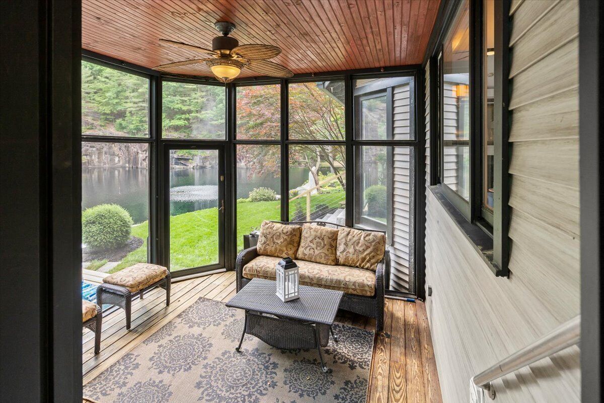 ~Screen porch off the kitchen leads to the hot tub overlooking the Quarry in the private backyard.
