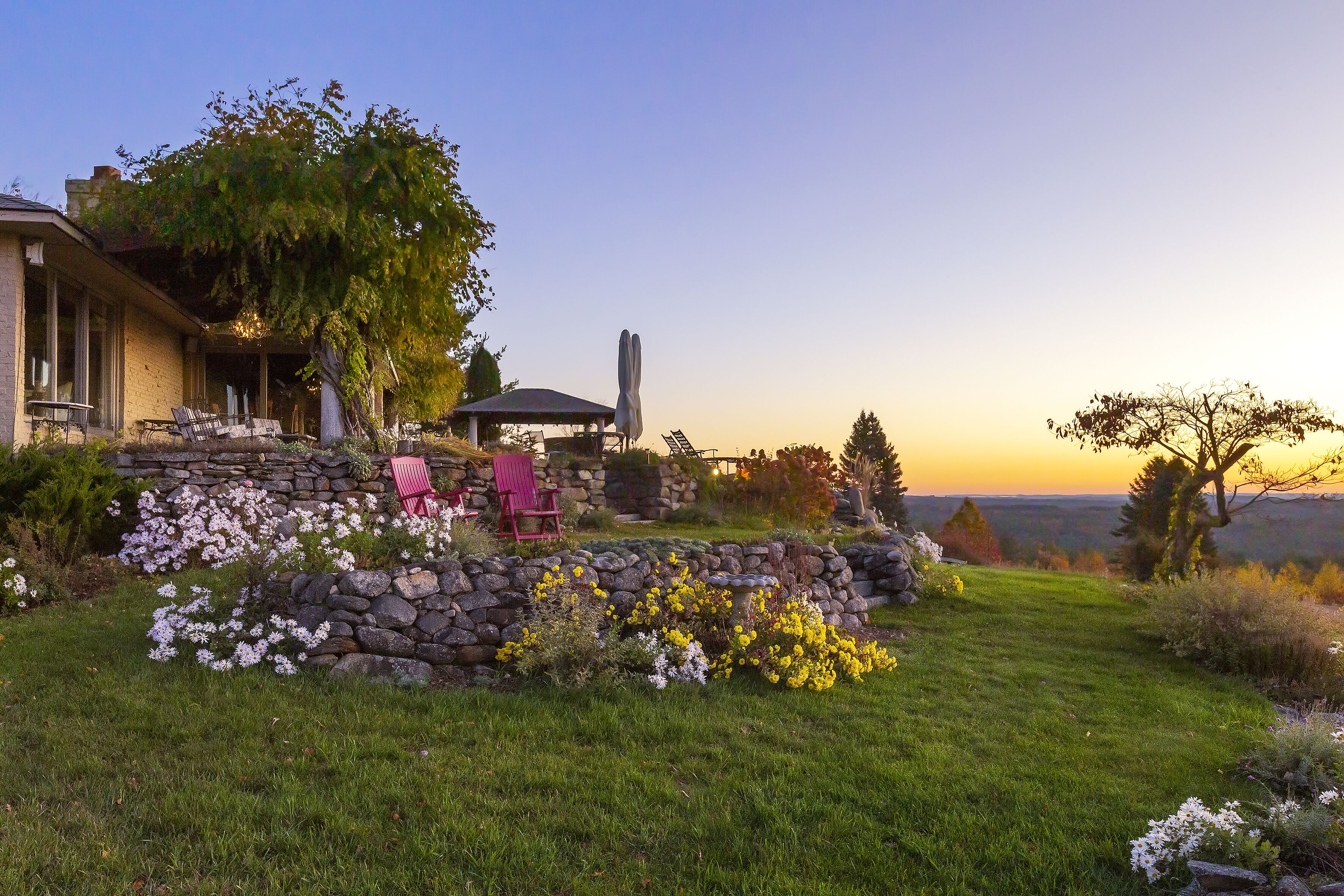 Outdoor living spaces abound, making this property truly exceptional. Residents can enjoy a custom stone fire pit, a covered porch overlooking the pool area, an open deck extending from the living room, and a well-appointed in-ground pool with an adjacent pool house perfect for entertaining. The meticulously landscaped grounds feature an apple orchard, ornamental trees, a grape trellis, and an array of perennial flowers, creating a harmonious blend of natural beauty and cultivated charm.