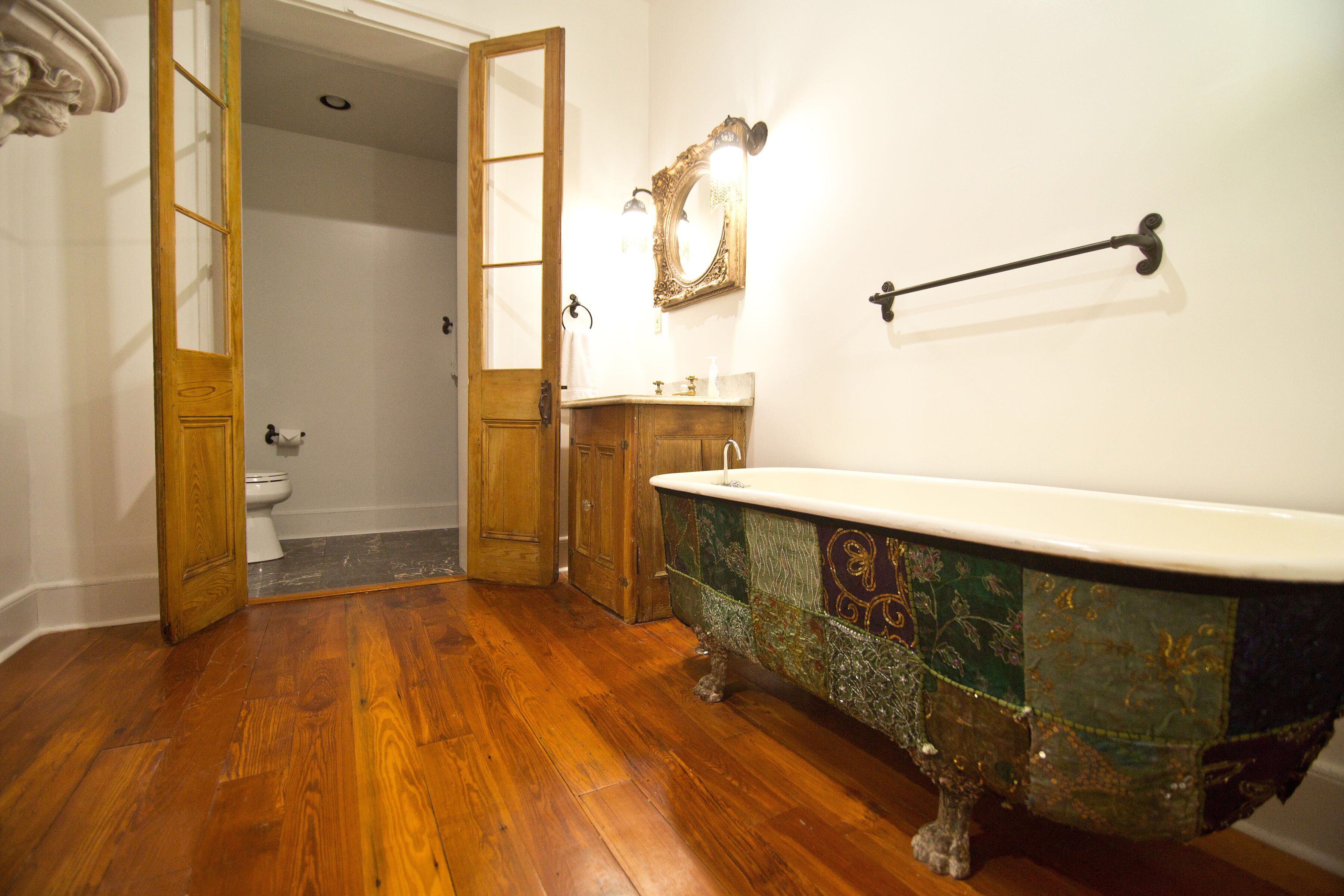This home features 13 foot ceilings, artists’ murals, a grand ballroom, large commercially equipped kitchen, a sprawling courtyard, and restored hardwood floors throughout. The space is accented with local New Orleans antiques curated for the right amount of Southern charm and comfort. Bedrooms feature Casper mattresses, a seating area, and plush down comforters.