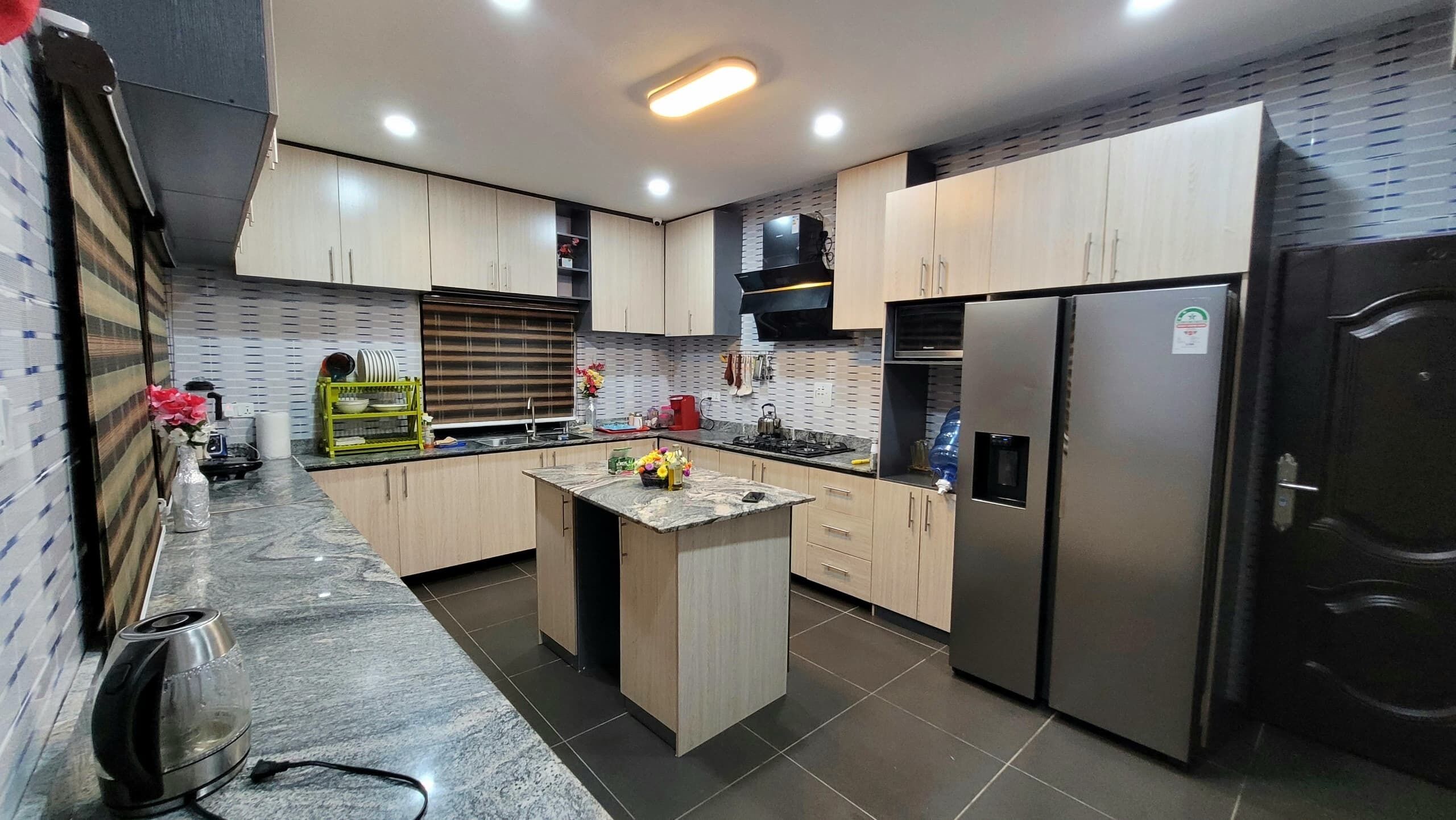 The modern fitted kitchen is a chef's haven, equipped with top-of-the-line appliances, including a dishwasher, side-by-side refrigerator, washing machine, dryer, oven, and a center working table that adds both style and functionality.