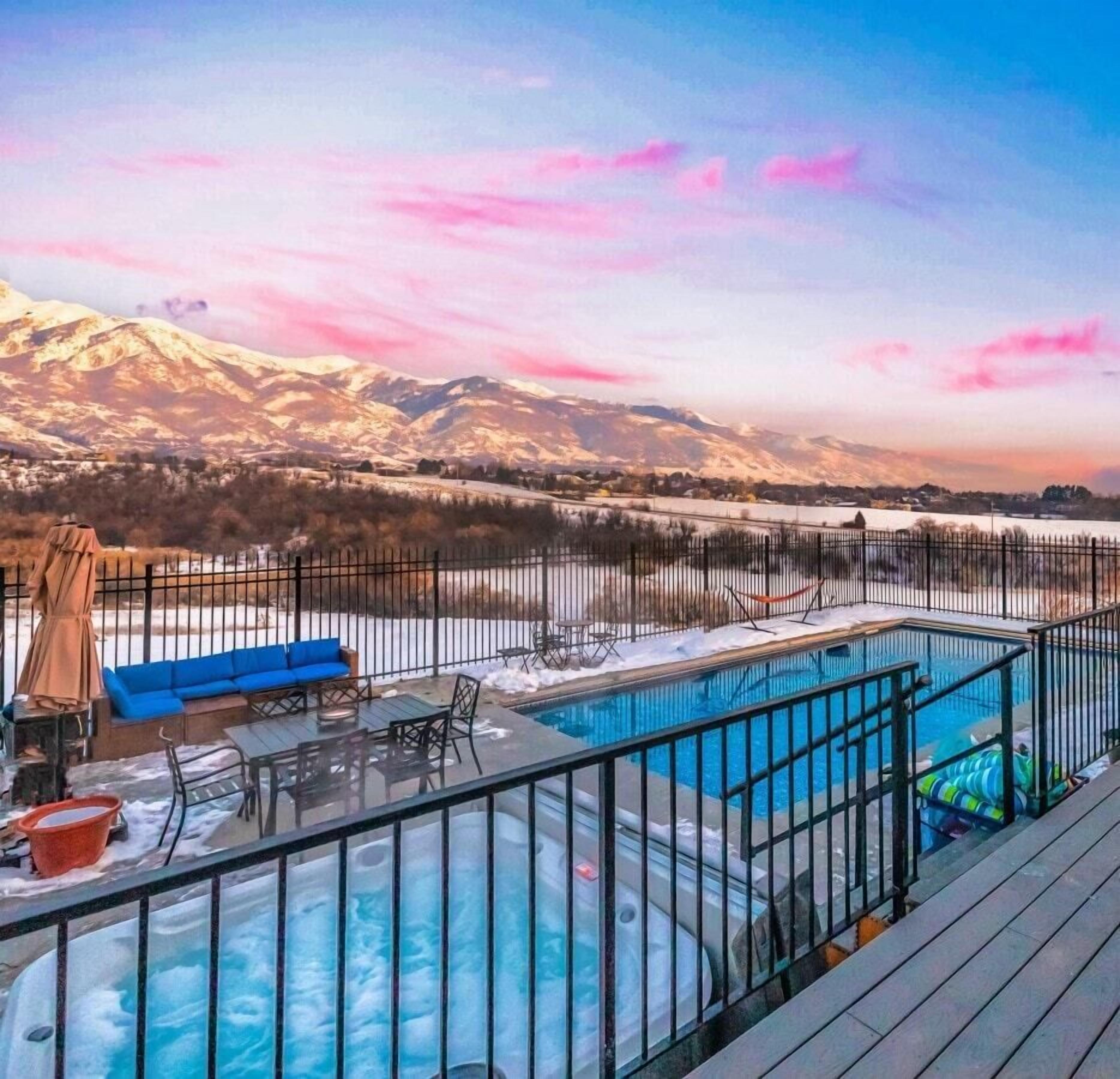 Escape to a peaceful hilltop retreat in Utah. This stunning Spanish-inspired home boasts 4 spacious bedrooms, a kitchen with new appliances, and unique living spaces all around. Relax in the outdoor oasis, complete with a heated saltwater pool & jacuzzi, or soak in the stunning mountain views from the secluded front courtyard. Conveniently located near Snow Basin Resort, Powder Mountain, and Valley Ski Resort, Park City/Sundance, Temple Square. Don't miss your chance to call this paradise home!
