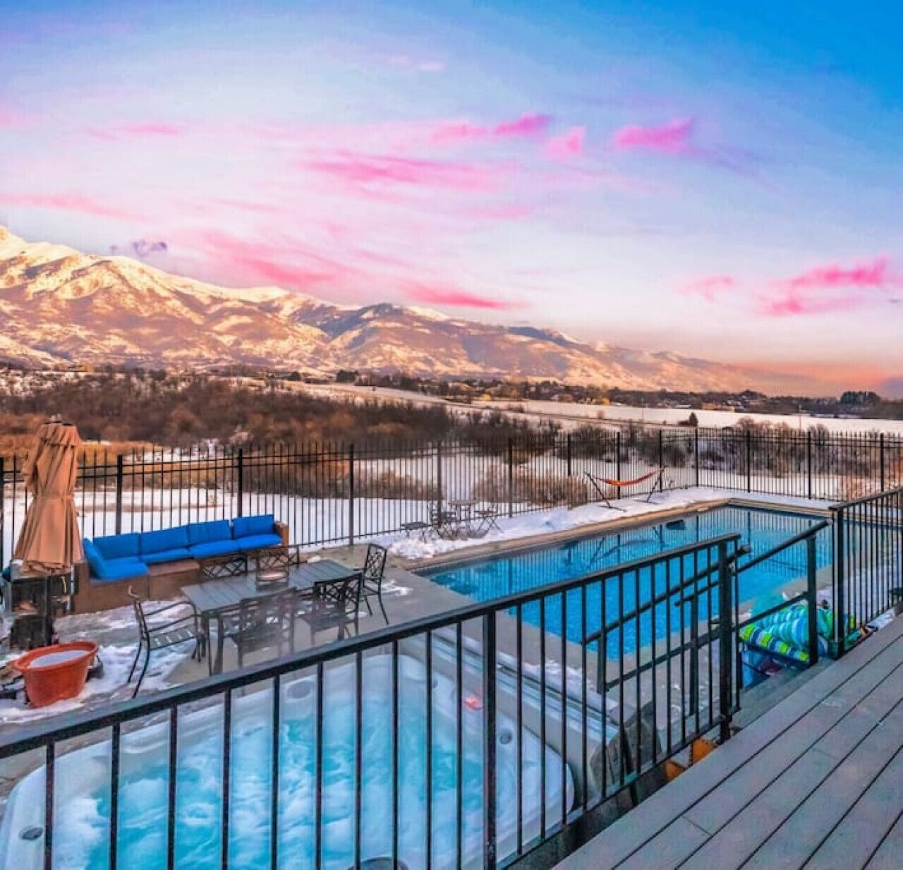 Come and experience the peace & serenity of our hilltop retreat in Utah. This stunning Spanish-inspired home offers 2 spacious bedrooms as well as a convenient laundry room and workout area. Spend your days lounging in the outdoor oasis, complete with a heated saltwater pool and jacuzzi, or soak in the stunning mountain views from the front courtyard. Located near Snow Basin Resort, Powder Mountain, Valley Ski Resort, Park City & Temple Square. Don't miss your chance to call this paradise home!