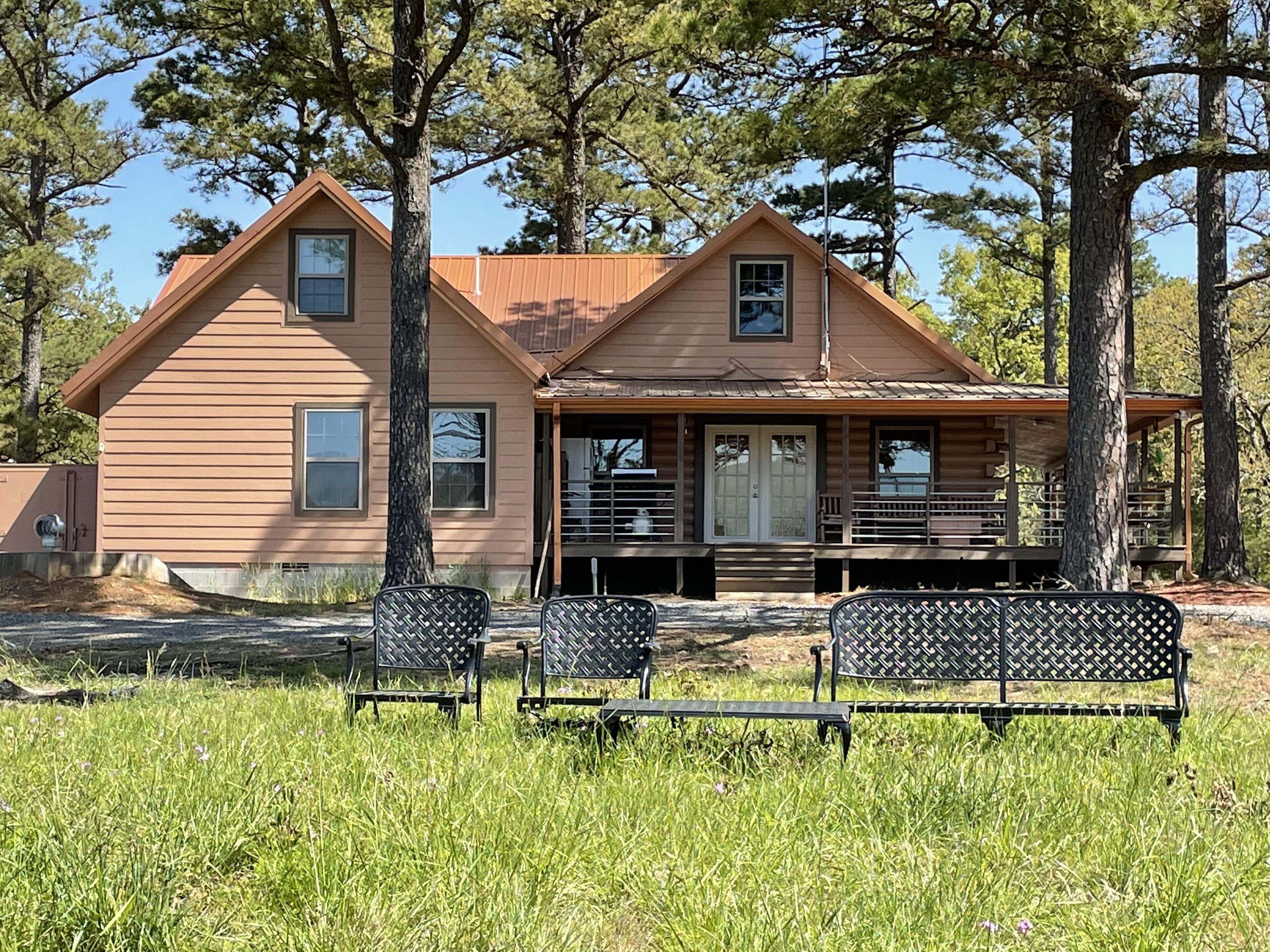 Copper Penny is an impressive, spacious 2400 sf Luxury Log Cabin Villa located in the beautiful and tranquil Ouachita National Forest area of the Ouachita Mountains that run between the states of Oklahoma and Arkansas. It is tucked away on a quiet 40-acre private property, removing you from busy streets and road noise. The property is surrounded by national forest, horse and hiking trails, has a large fishing pond and sits adjacent to Post Mountain Lake which also provides excellent fishing. This stunning cabin has it all with fantastic views while still being just minutes away from all the fun and adventure of restaurants, shops, Sardis Lake and Ouachita Forest National Park. It’s a perfect place to unwind and relax while creating new memories with family and friends. The open concept living area has soaring ceilings with a stone fireplace and plenty of seating. There are outstanding views of the mountains and forest behind the cabin. The modern kitchen has beautiful granite countertops and stainless appliances and is fully stocked with dishes, silverware, glassware, and cookware – everything you need to cook or entertain!