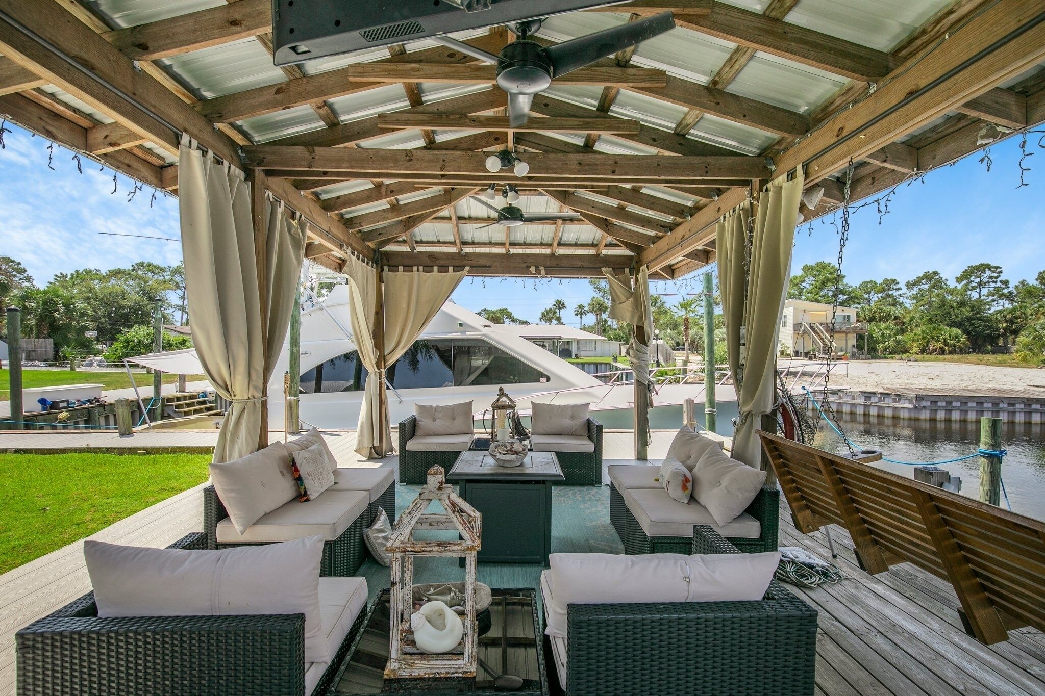 Our Newly Remodeled waterfront property is located on prestigious Marina Road in Orange Beach, Alabama. The property comprises of 2 boat slips for guest use, that has a waterfront wrap around decking for easy accessibility. The deck area includes a furnished gazebo with TV, fish cleaning station, beach/fire pit area, and plenty of room for fishing and swimming.