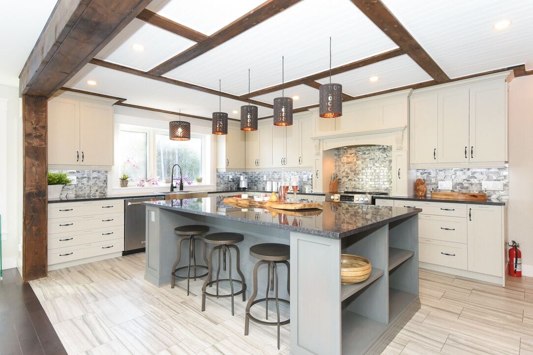 Open concept kitchen and bar area offering plenty of storage space, extra large island and a custom bar for entertaining.
