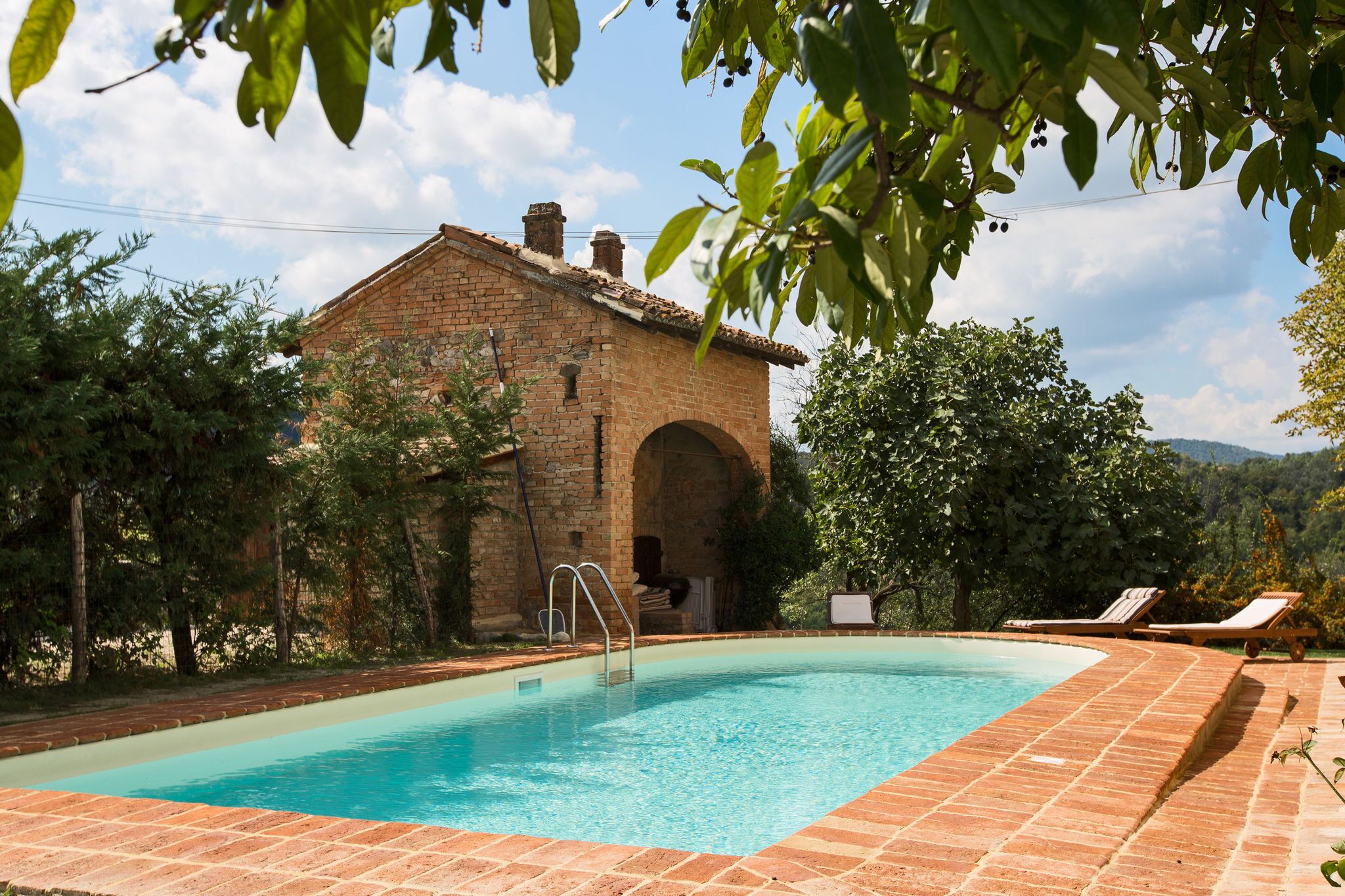 Outside, you will find a large garden with a saltwater swimming pool (15m x 5m; depth 1.5 m; open 15 May-15 October depending on the weather) with a sun terrace (with sun loungers). Next to the swimming pool there is an area with an ancient oven, pizza oven and barbecue, that can be adapted for different types of events.