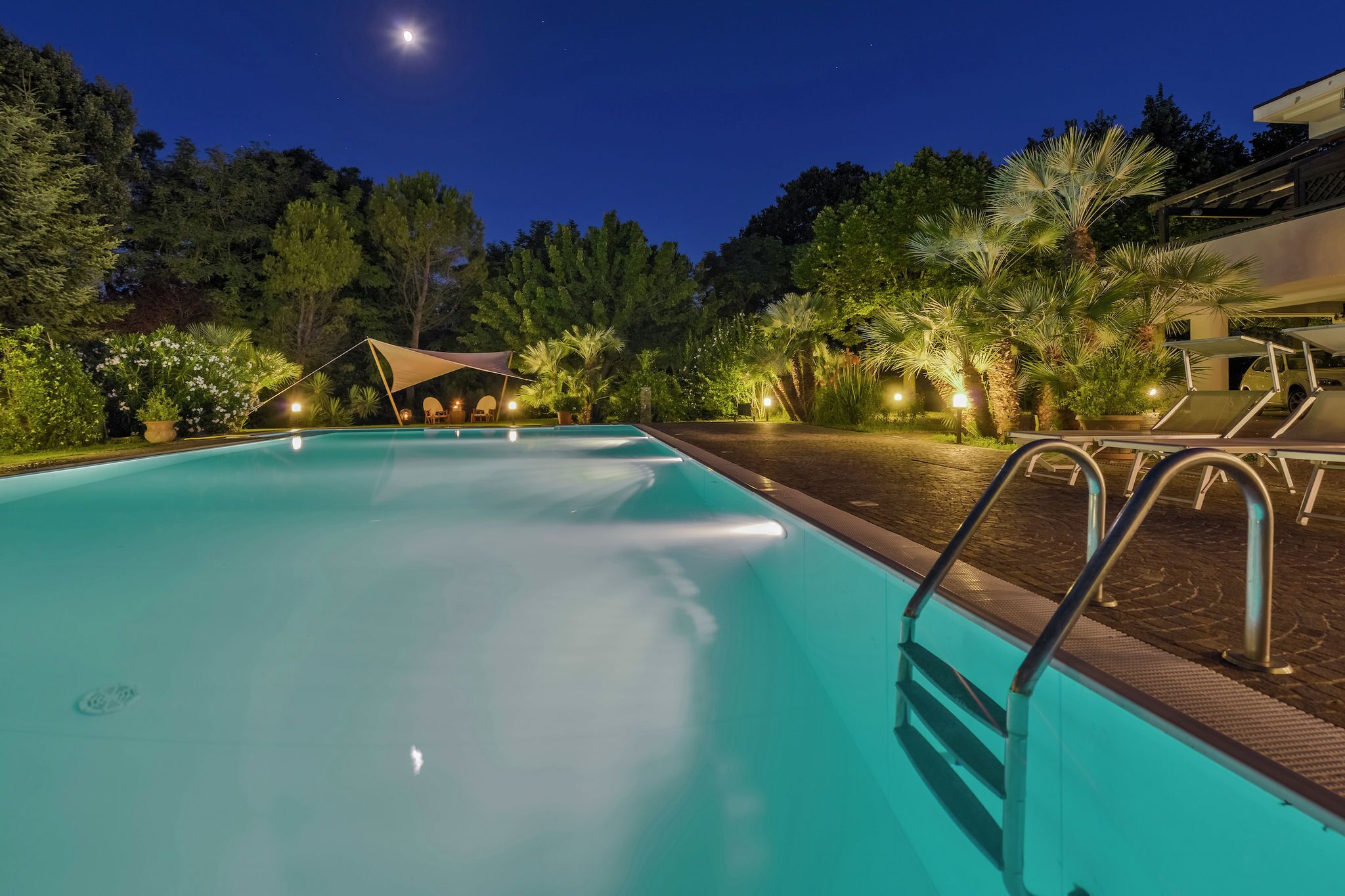 at guests' disposal the large, completely fenced park that surrounds the whole villa where we have barbeque, several realx corners with sitting areas, benches, tables and fountains, 5x10 mt swimming pool with sun loungers, tables, benches and cushions, umbrella, fully equipped porch with table dining room for 15 people, sofas and sitting areas.