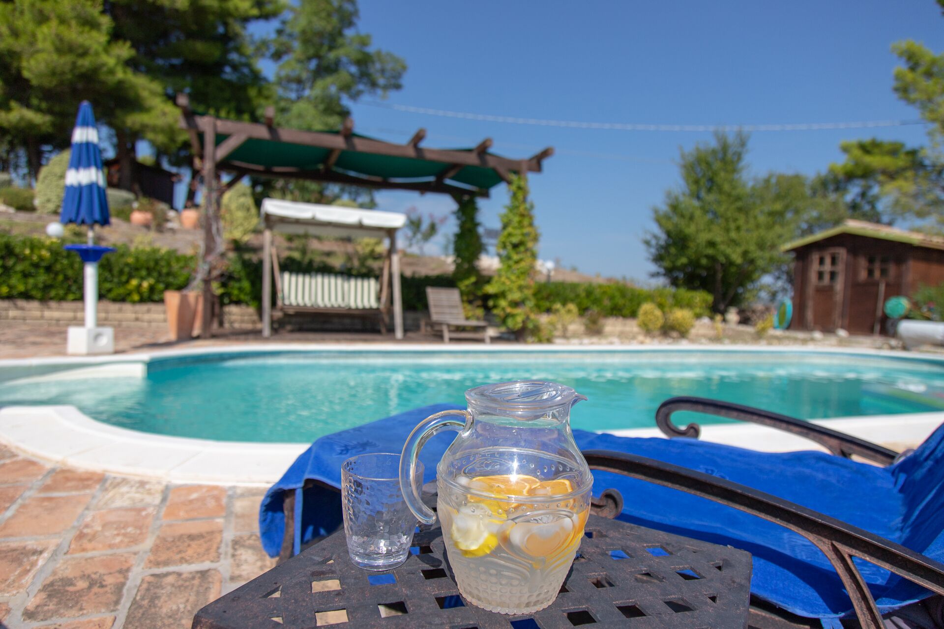 The first floor terrace has outside stairs leading down to the gardens and the welcoming and substantial swimming pool with Roman steps. The swimming pool is unfenced and young children will need to have adult supervision at all times. The pool has adjacent decking under a shaded pergola. There are plenty of cushioned deck chairs, sun loungers and sun umbrellas on the Maiella stone pool surround and there is a swing seat and also a hammock strapped under the adjascent shady pine trees . .