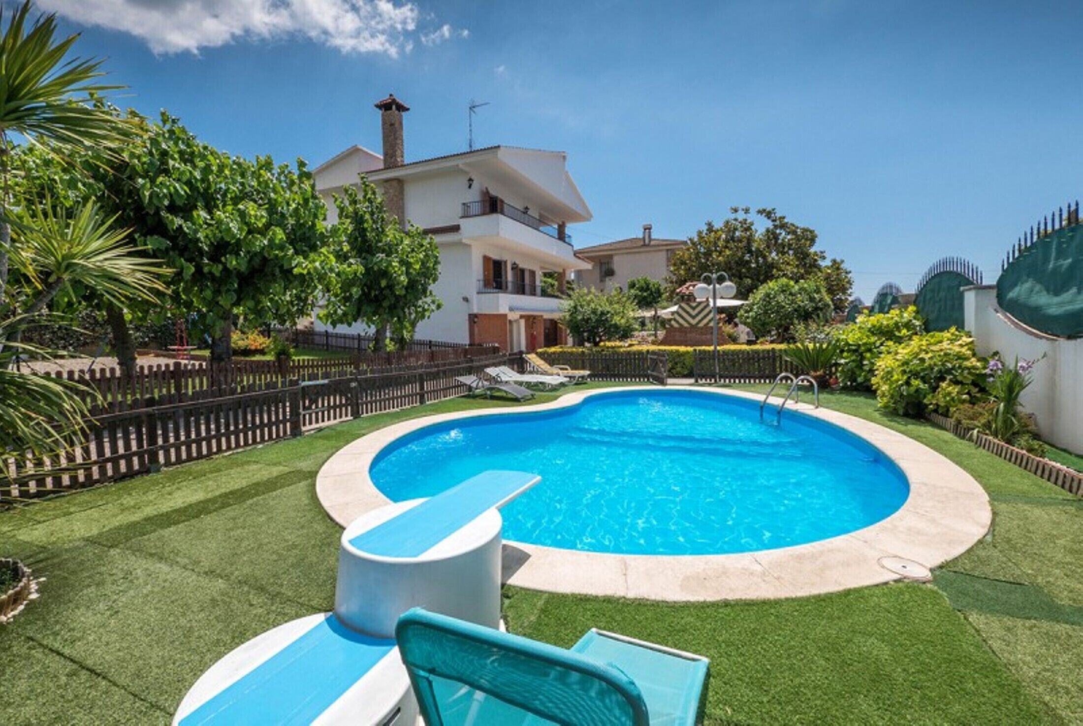 Modern Villa Malibu is conveniently located in Pineda de Mar “Costa Barcelona”, at walking distance to the beach, supermarket, restaurants and center of town. Pineda de Mar is a nice family coastal town with long beaches, water activities, boulevard, shops and restaurants.This brand new villa has been recently constructed with quality materials and completely equipped with modern furniture and appliances. Enjoy the luxury of this beautiful home with its ample garden and pool on the same level as the living area, and at only a 3min walk to the beach! The villa is entirely fenced.During your stay, you have exclusive access to the Aqua Park behind the villa! Unique in the villa rental market, it is the ideal combination of renting your private design villa while enjoying the commodities of a holiday resort. Kids will enjoy themselves in the waterpark which includes various slides and pools, a children's paradise!(*the waterpark is scheduled to be open between 10/05/25 - 21/09/25, subject to the hotel's opening dates)You enter the villa via an automatic gate, behind which there’s an ample car park for various cars.On ground floor you’ll find the bright living room with large sofa and dining table. TV with Netflix account included.Bathroom with shower. Fully equipped open kitchen. From here you have direct access to the terrace and pool area. Separate washing room with washing machine and dryer.Covered terrace with large exterior dining table for 10. Garden with private pool of 3mx8m, children’s playground, pergola, and 10 sun loungers. Stone BBQ.Its beautiful exterior area make this an ideal holiday home for families with children, who will no doubt have fun playing here!On the first floor there are 4 bedrooms and three bathrooms:- master bedroom with ensuite bathroom (shower)- double bedroom with ensuite bathroom (shower)- bedroom with 3 single beds- bedroom with 3 single beds- third bathroom (shower)All rooms have electric shutters and air conditioning. Wifi throughout the whole villa, including the garden.The villa is located one block from the beach (200m), where you can enjoy various water activities, beach bars, restaurants, the boulevard,… A small supermarket is located at only 50m from the house, ideal to get your daily groceries and fresh bread. Pineda de Mar’s train station is located 1km from the villa. Barcelona is a 45min drive, and Girona a 40min drive.The beautiful Costa Brava is only a 15min drive.* A bath towel set per person is included* Unfortunately pets are not accepted, nor do we accept groups of youngsters in this villa. The minimum age is 28.