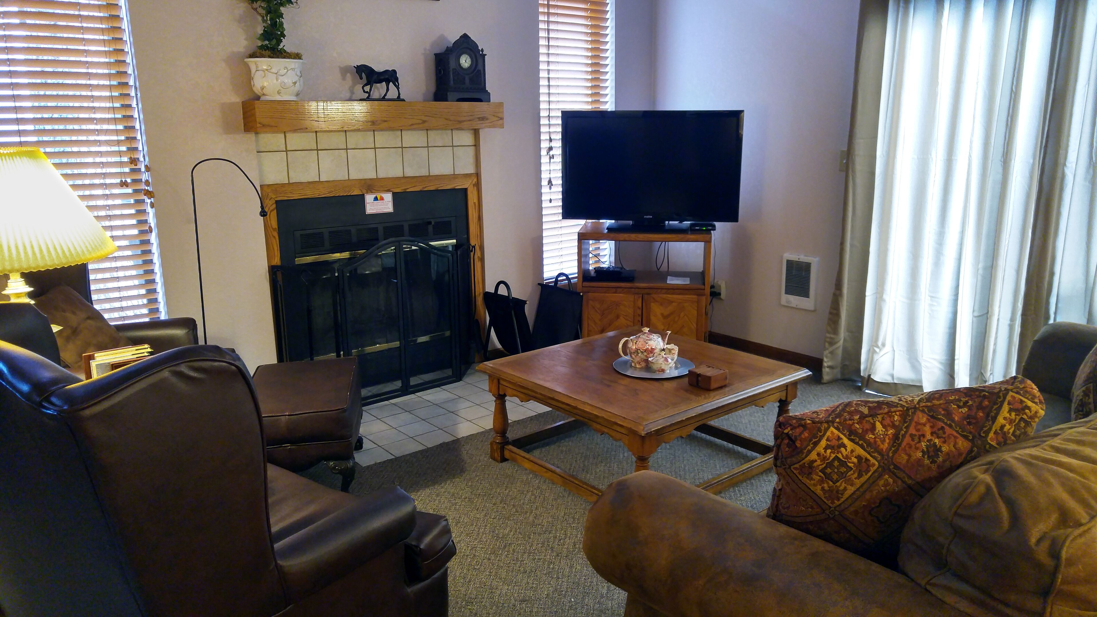 A private attached garage with entrance into the Villa is yours to keep your vehicle and other belongings safe from the elements all year long. Extra wood for the fireplace is available for purchase in the garage, eliminating the need for shopping around town. A separate front entrance to the villa offers choices when leaving or entering your villa. Out back, you have access to a private patio furnished with a table and chairs, and is equipped with a propane grill/BBQ for those warmer summer nights under the stars.